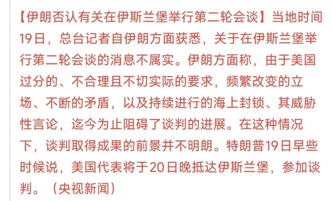 第二轮谈判到底开不开?美国和伊朗完全是各抒己见对于第二轮美伊谈判特朗普这边是非常的积极,不止定好了人员,还把日期都定好了,特朗普对外宣布是今天晚上。而伊朗方面就是对立了,伊朗一直在极力否认将开启第二轮谈判,非要美国先答应一些条件才会出席谈判。