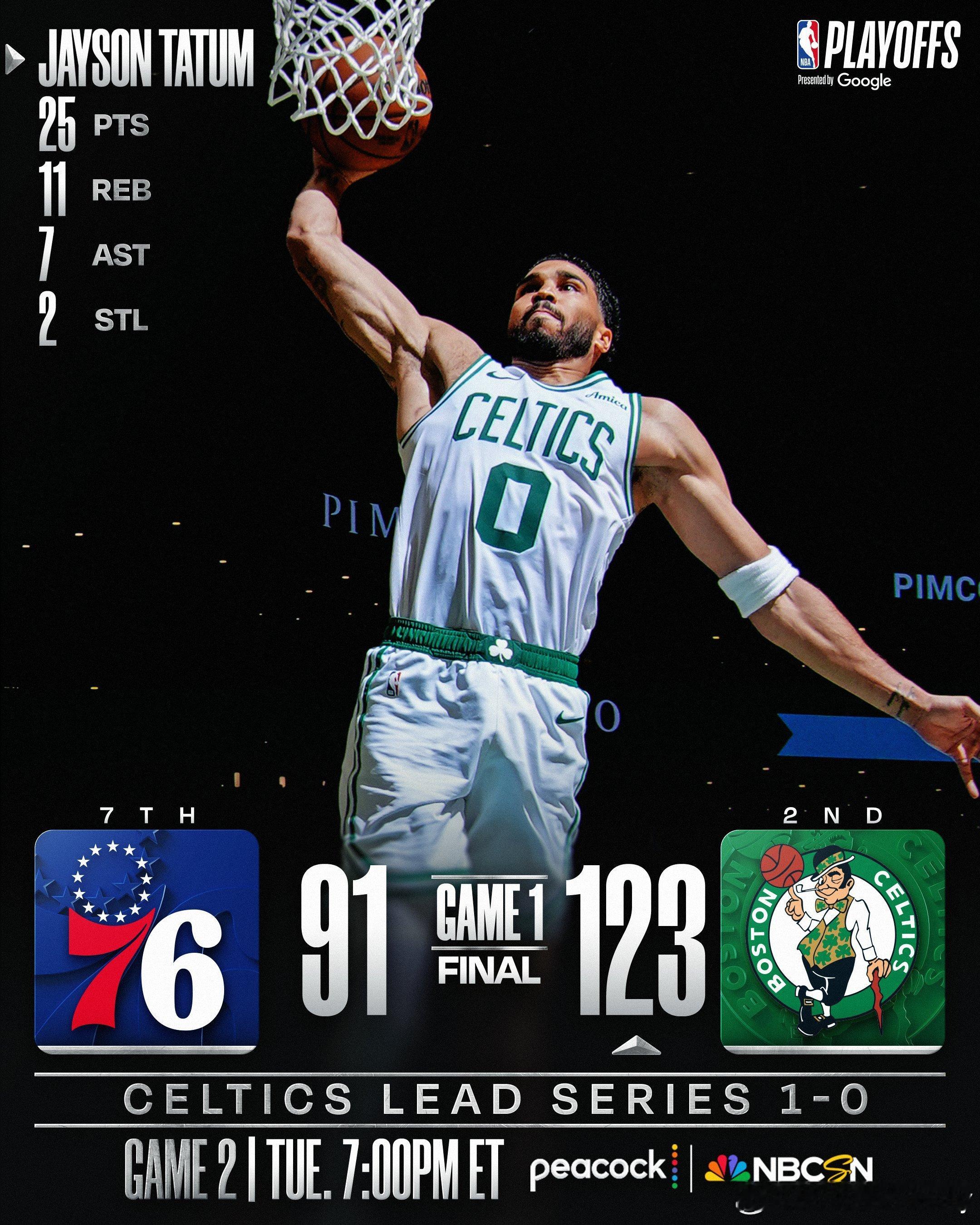 毫无悬念,凯尔特人123:91狂胜76人32分!拿下首战。系列赛1-0领先。76