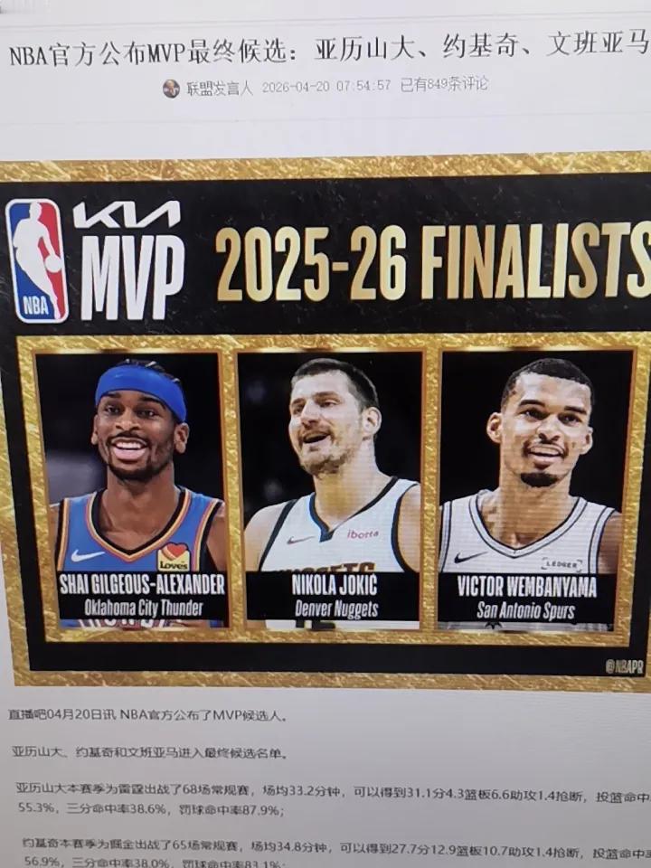 约基奇的球队战绩不行, 亚力山大不受球迷喜欢, 所以,MVP是文班亚马的,这样都