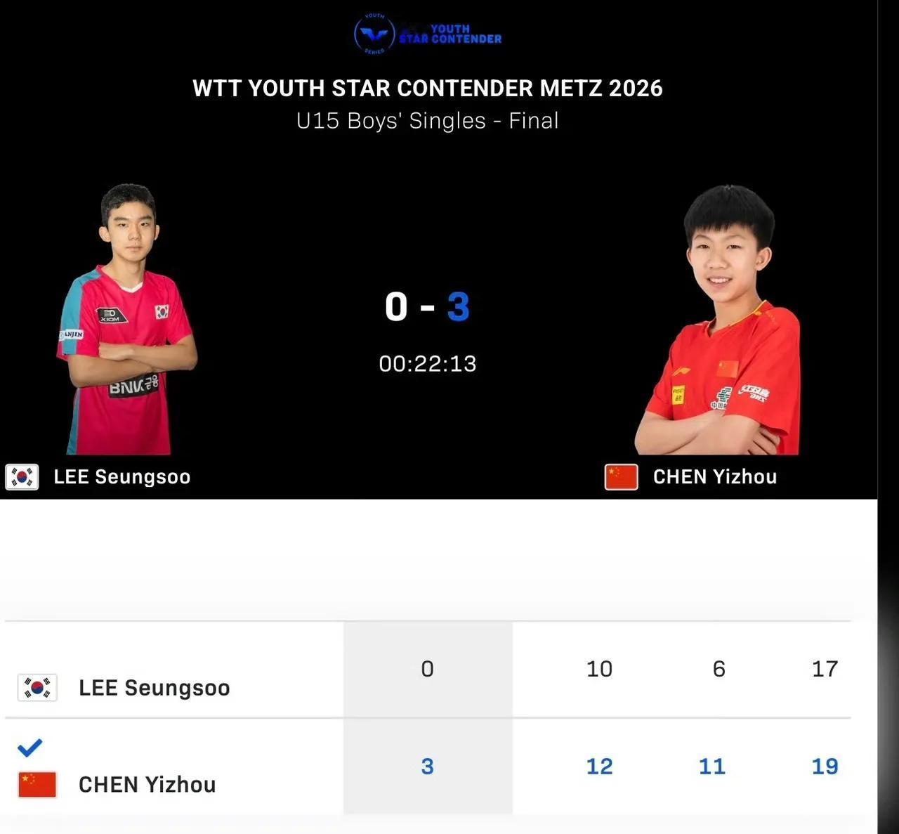 U15男单国乒14岁小将陈逸舟3一0战胜韩国14岁小将李承洙获得冠军[赞][赞][赞]17岁的李和宸U19,1一3输李承洙,14岁的陈逸舟U15,3一0赢李承洙,竞技体育变化无常输赢正常,努力拼搏就能实现梦想,加油加油。