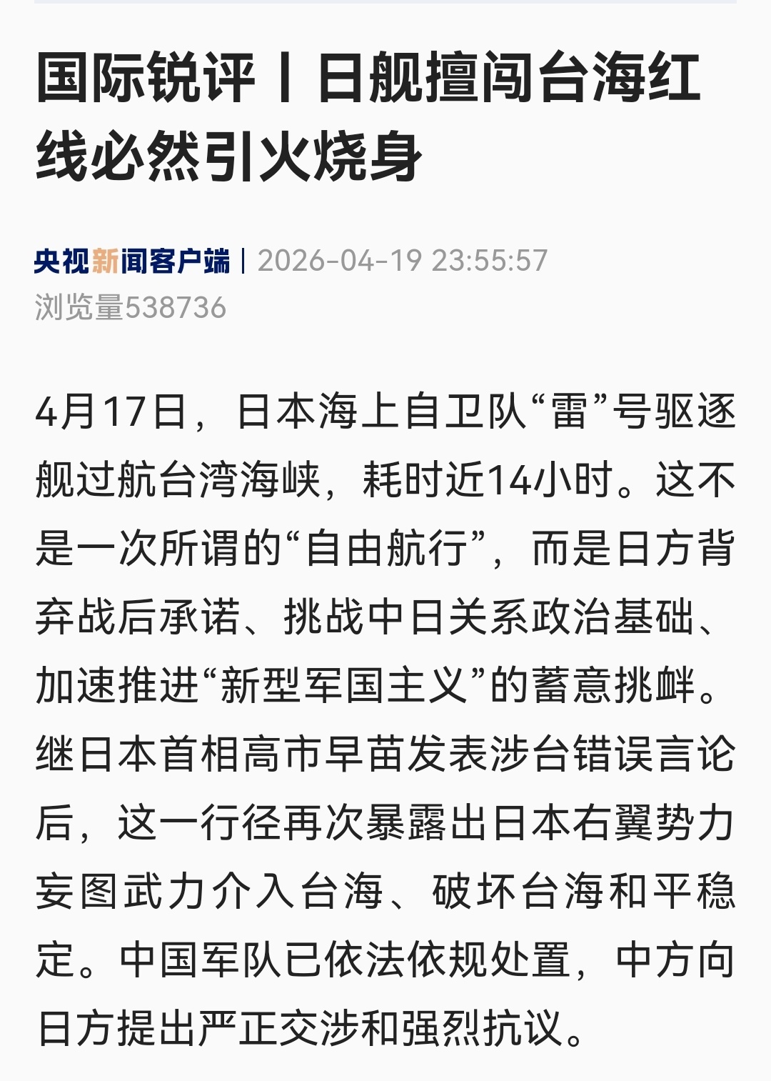 日自卫队舰艇进台湾海峡央视发表评论称日舰擅闯台海触及红线,并且明确指出日本“雷”号驱逐舰在4月17日(《马关条约》签订日)穿越台海,不排除故意借敏感节点制造事端、伤害中国人民感情,同时为“台独”势力撑腰打气,妄图强化其在亚太的军事存在。