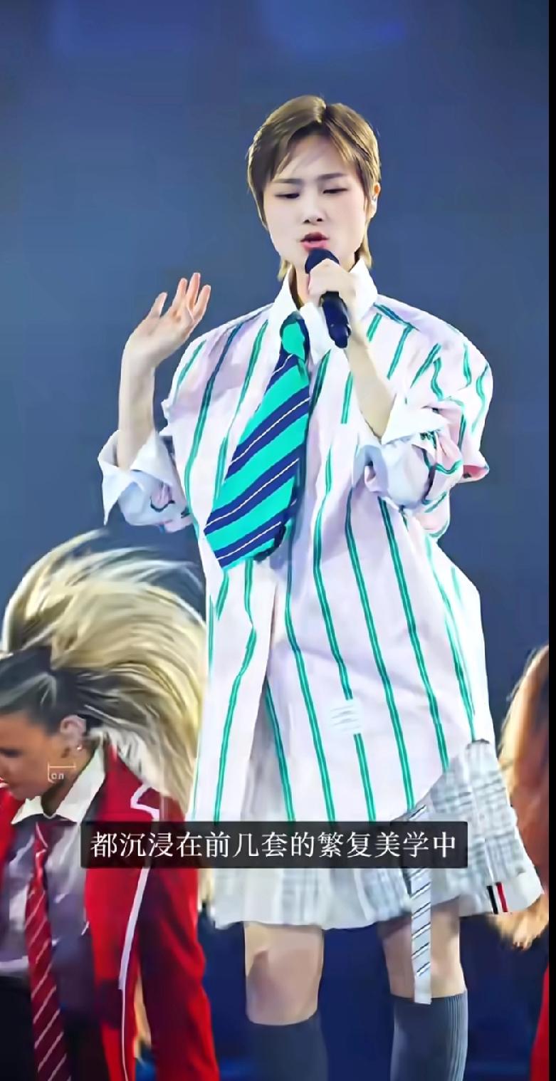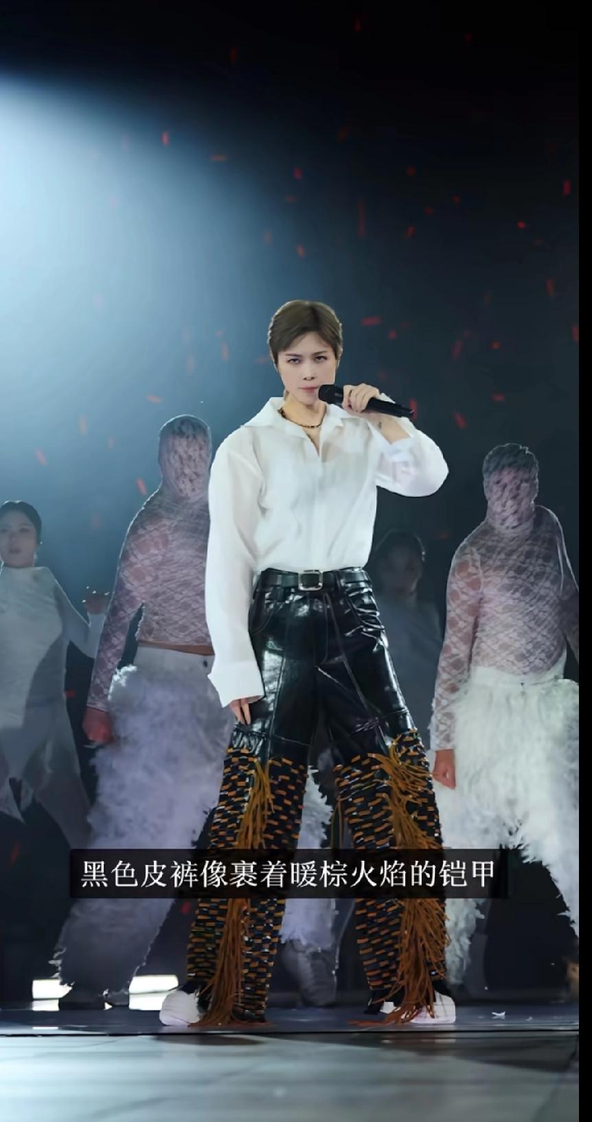 金色闪钻西装自带舞台王者气场,半透白衬衫配皮裤又酷又野,还有那套白色收腰大裙摆,利落得像古希腊雕塑在发光。一套又一套的造型,不是简单的好看,是真的在给舞台美学“亿点震撼”。