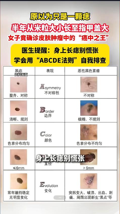医生也提醒大家,平时可以多留意自己身上的痣,如果发现有不对称、边缘模糊、颜色杂乱,或者直径超过6毫米,还有短期内突然变大、破溃、瘙痒的情况,一定要及时去医院检查,别再当成普通的痣忽视了,健康从来都不是小事,别让一时的侥幸,变成终身的遗憾,有时候多一份谨慎,就能多一份保障。
