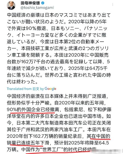 日本前航空幕僚长田母神俊雄声称,中国时代已然终结!4月19日,田母神俊雄表示,虽然日本媒体很少报道“中国经济崩溃”,但情况似乎十分严峻。2020年之后的五年间外资“已撤离”90%,日本方面索尼、松下、伊藤洋华堂等众多企业也已“撤出”。此番日本第二大车企本田技研工业,将关闭位于广州和武汉的两家燃油车工厂。