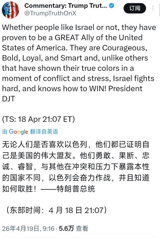 特朗普今天(北京时间4月19日)写道:“无论人们是否喜欢以色列,他们都已证明自己是美国的伟大盟友。他们勇敢、果断、忠诚、睿智,与其他在冲突和压力下暴露本性的国家不同,以色列会奋力作战,并且知道如何取胜!”