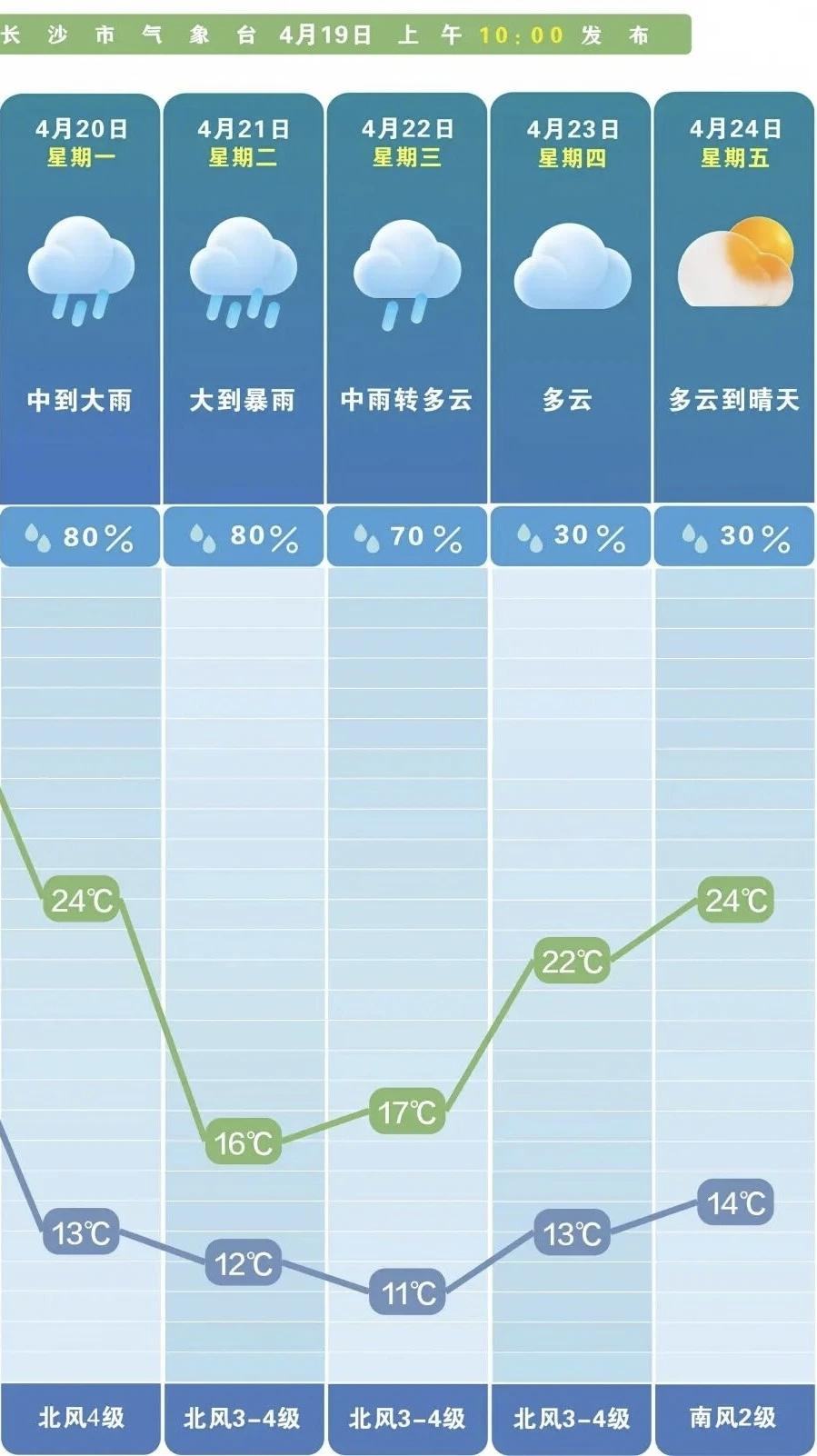 伴随谷雨节气到来,长沙的天气也将迎来剧烈转折,晴暖天气快速下线,强降雨、大幅降温与强对流天气接踵而至。根据长沙气象、长沙县气象台发布的最新预报,4月20日当天,长沙全域多云转大雨,局地中到大雨,城区气温13~24℃,长沙县气温16~22℃,北风风力逐步加大。