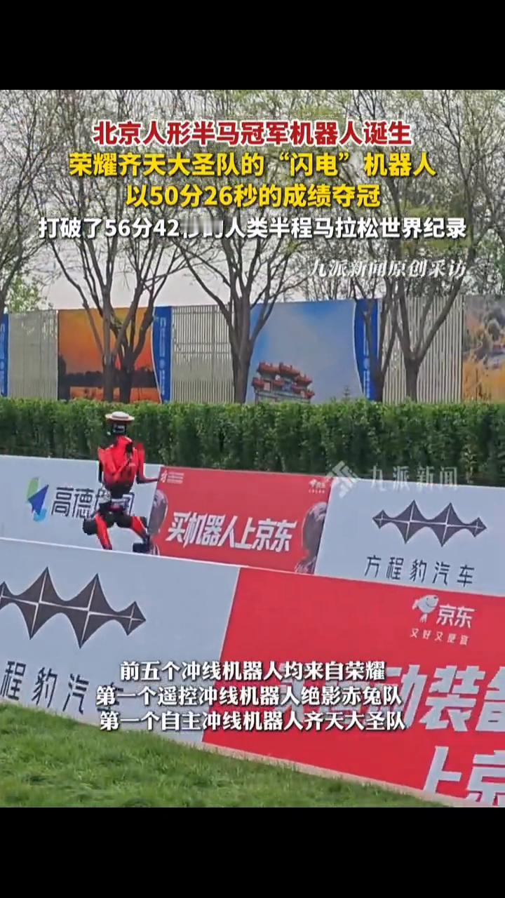 北京人形半马冠军机器人诞生,荣耀齐天大圣队的"闪电"机器人以50分26秒的成绩夺冠,打破了56分42秒的人类半程马拉松世界纪录。