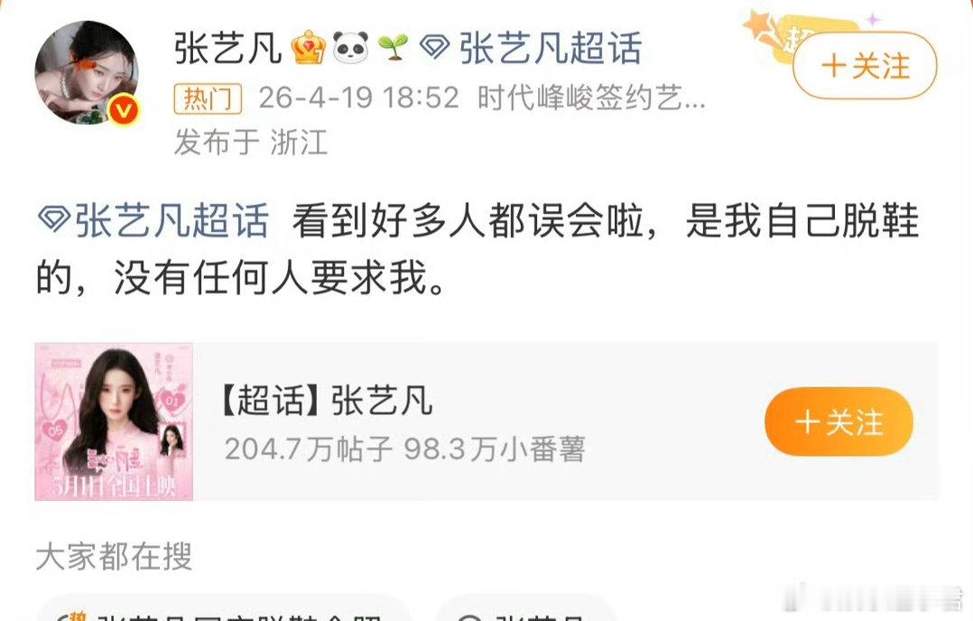 张艺凡回应脱鞋合照张艺凡回应:“看到好多人都误会啦,是我自己脱鞋的,没有任何人要求我”。