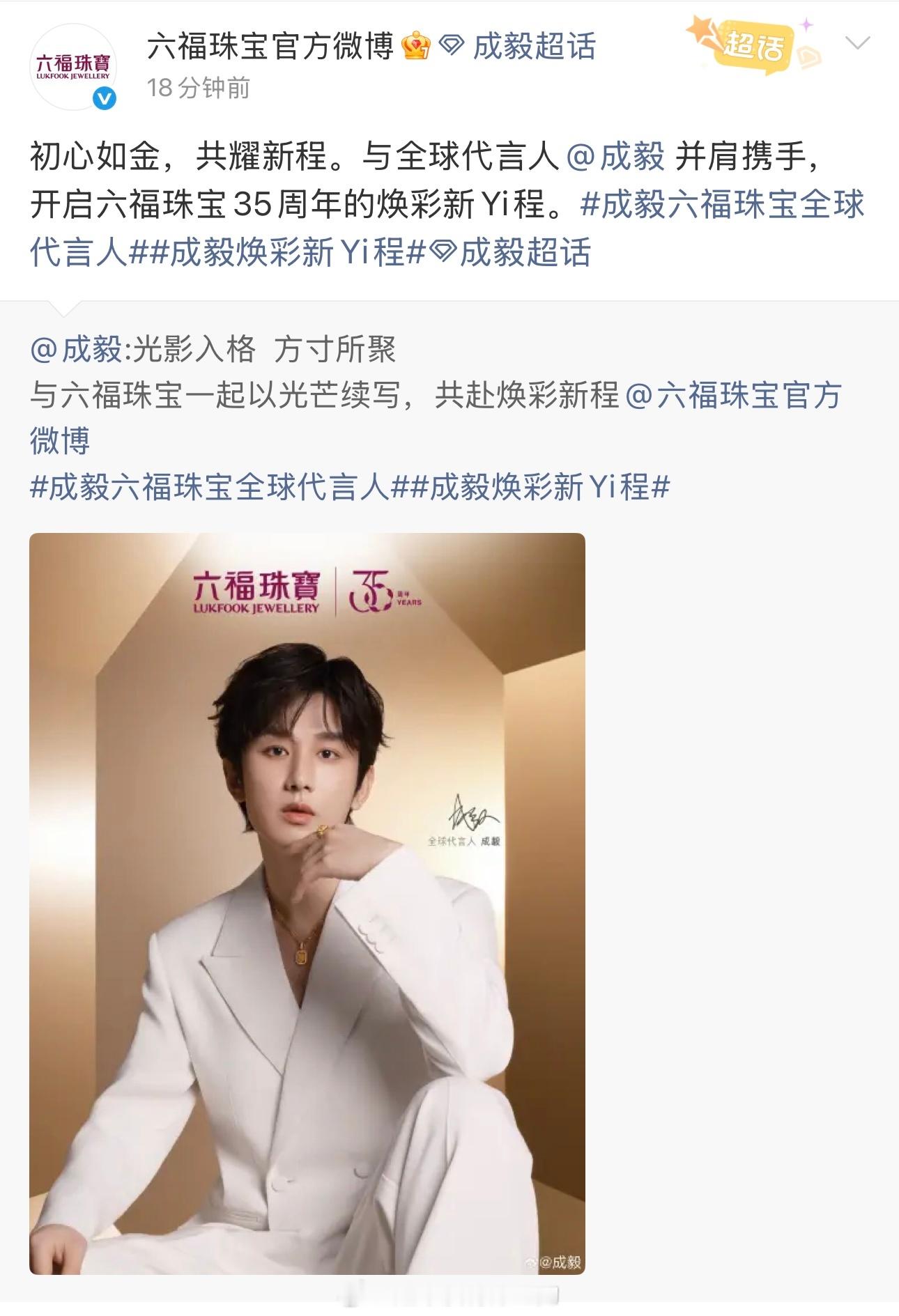 成毅六福珠宝全球代言人官宣,恭喜成毅