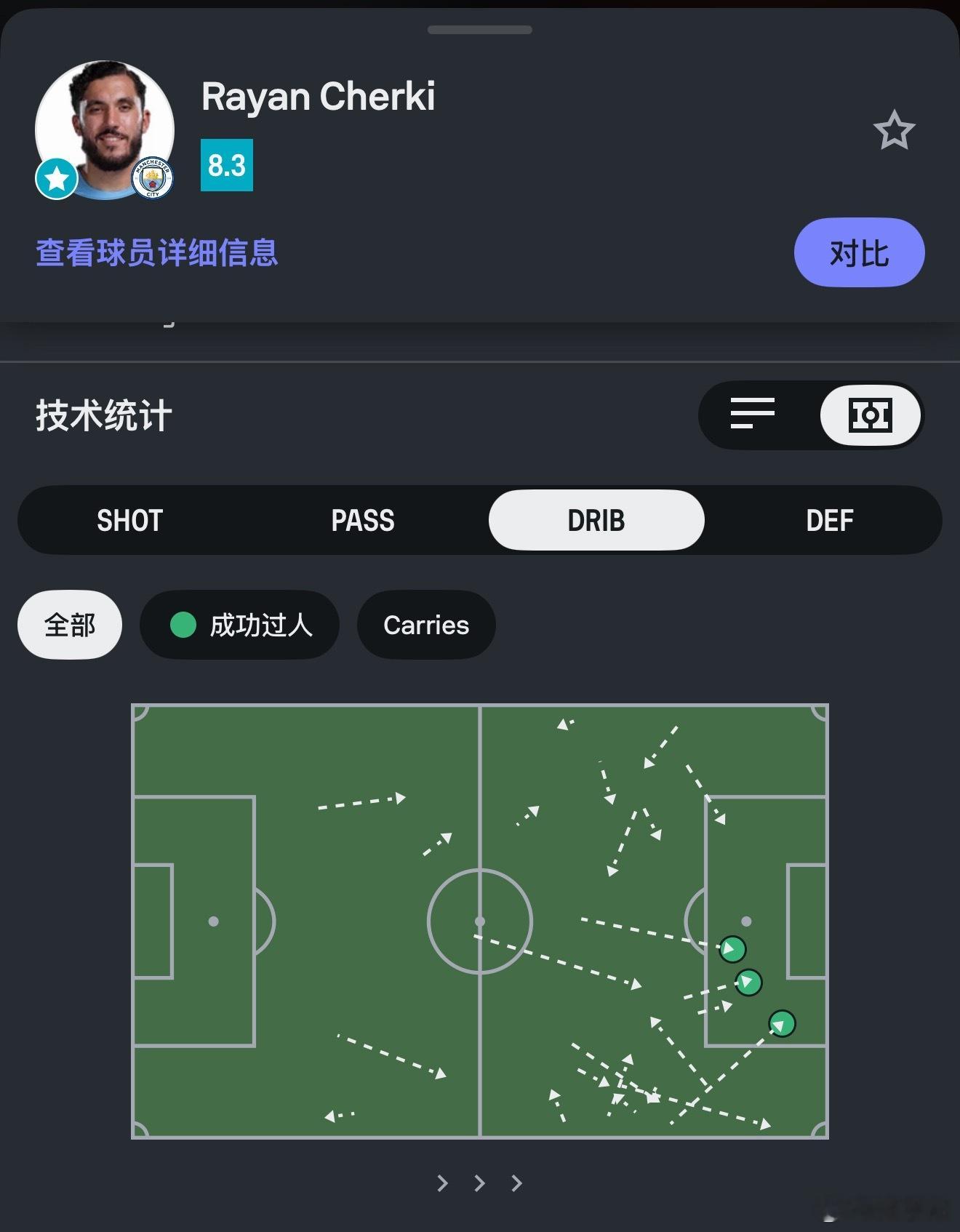 曼城前场两个持球突破能力很强的,多库更多集中在左边路(图五),谢尔基右路和正面能能带球威胁阿森纳防线(图四)。再看下阿森纳本场有没有这样的球员?