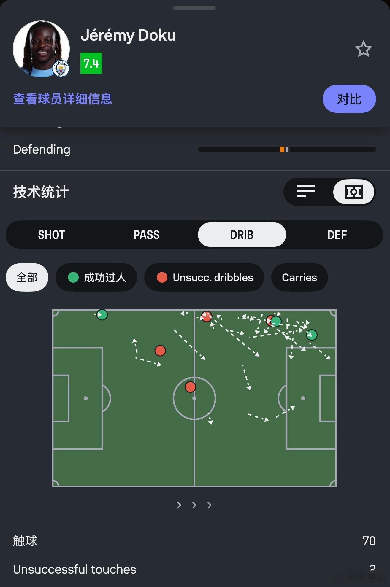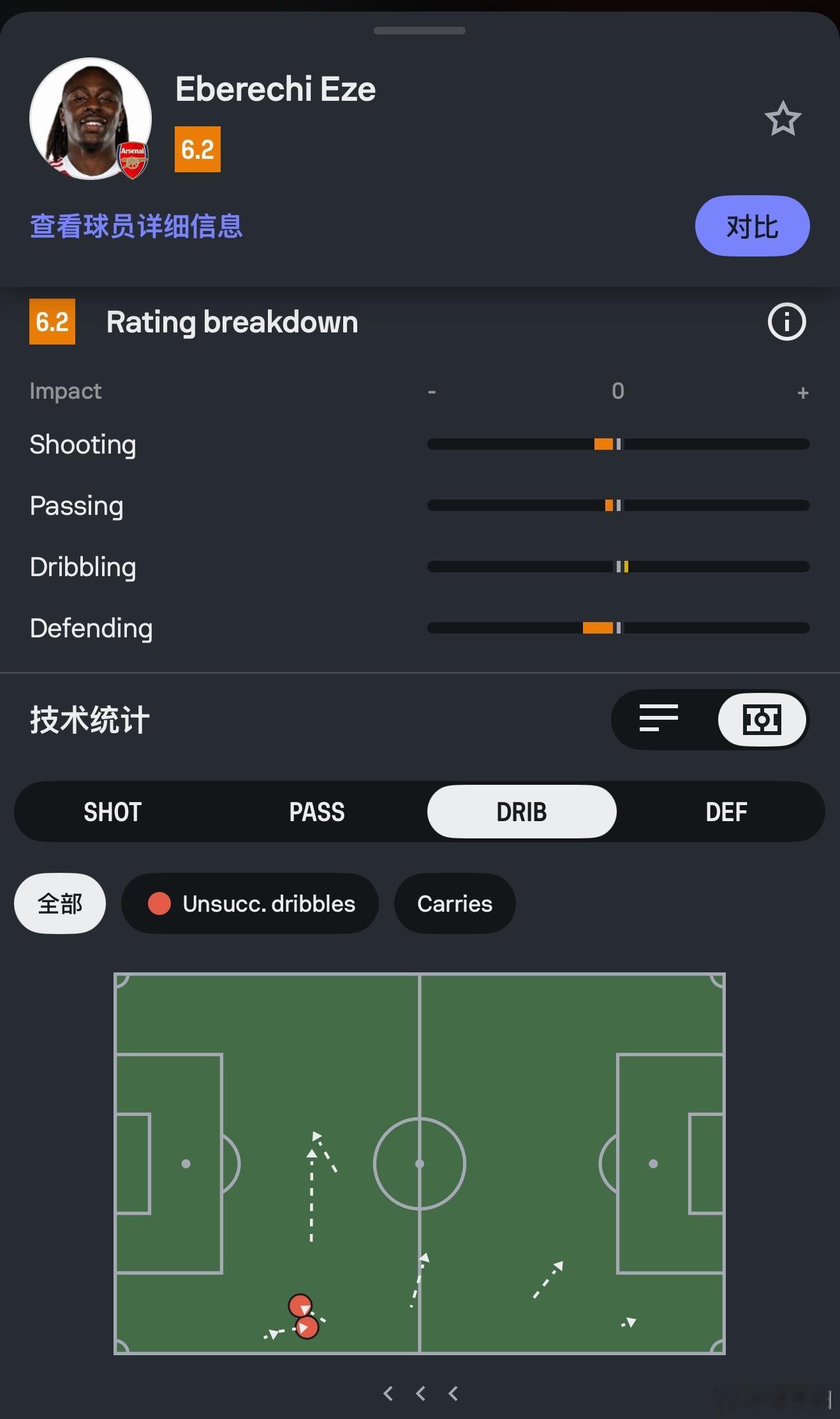 萨卡受伤的情况下,埃泽本身有这个能力,但是他这场的带球突破有几次(图六)?多库全场触球 70 次,谢尔基是 63 次,反观埃泽只有 27 次。