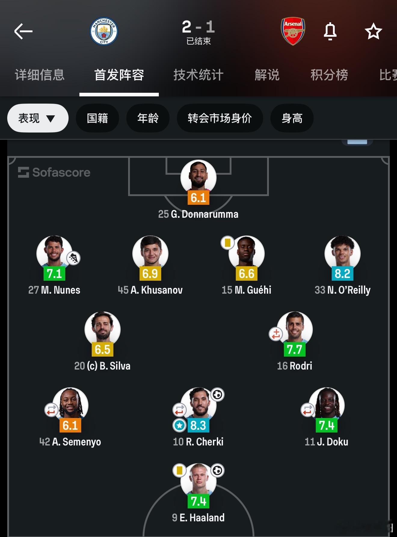 曼城vs阿森纳赛前就预感谢尔基可能会是曼城破局的关键角色(图一),事实证明的确如此。第一个进球完全是他个人能力体现。赛后他的得分全场最高也是合理。