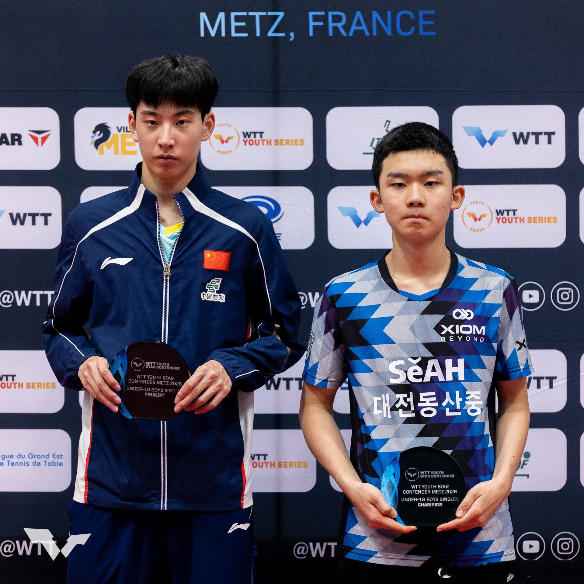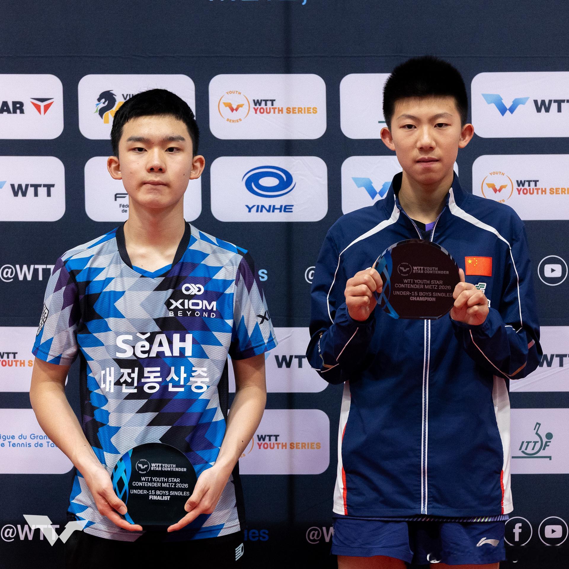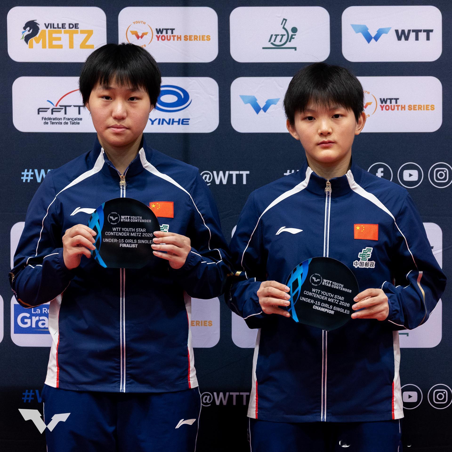 WTT青少年球星挑战赛梅斯站2026U15女单冠军:🇨🇳祝启慧🥇 亚军:🇨🇳孙笑薇🥈U15男单冠军:🇨🇳陈逸舟🥇 亚军:🇰🇷李承洙🥈U19女单冠军:🇰🇷李慧潾🥇 亚军:🇫🇷阿莱西亚·诺丁🥈U19男单冠军:🇰🇷李承洙🥇 亚军:🇨🇳李和宸🥈