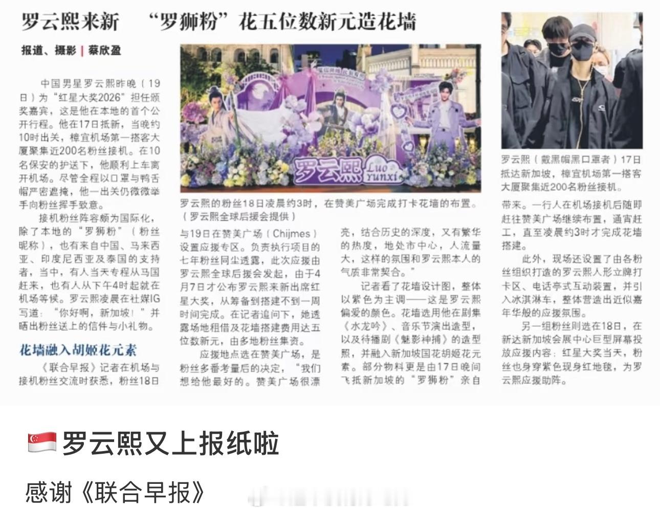 罗云熙新加坡红星大奖上《联合早报》了媒体还报道罗狮粉花五位数新元造花墙兔兔们太有实力了好优秀罗云熙罗云熙