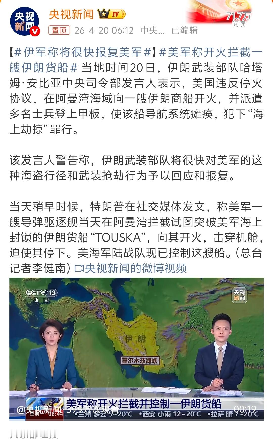 美军武力拦截伊朗货船伊军称将很快报复美军上周五说结束了,霍尔木兹海峡开放!这才几