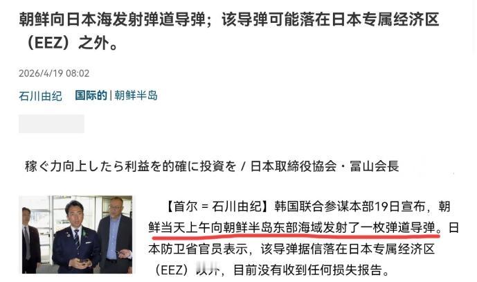 4月19日,根据日本产经新闻报道,日媒称,朝鲜当天上午向朝鲜半岛东部海域发射了一枚弹道导弹。日本防卫省官员表示,该导弹据信落在日本专属经济区以外,目前没有收到任何损失报告。