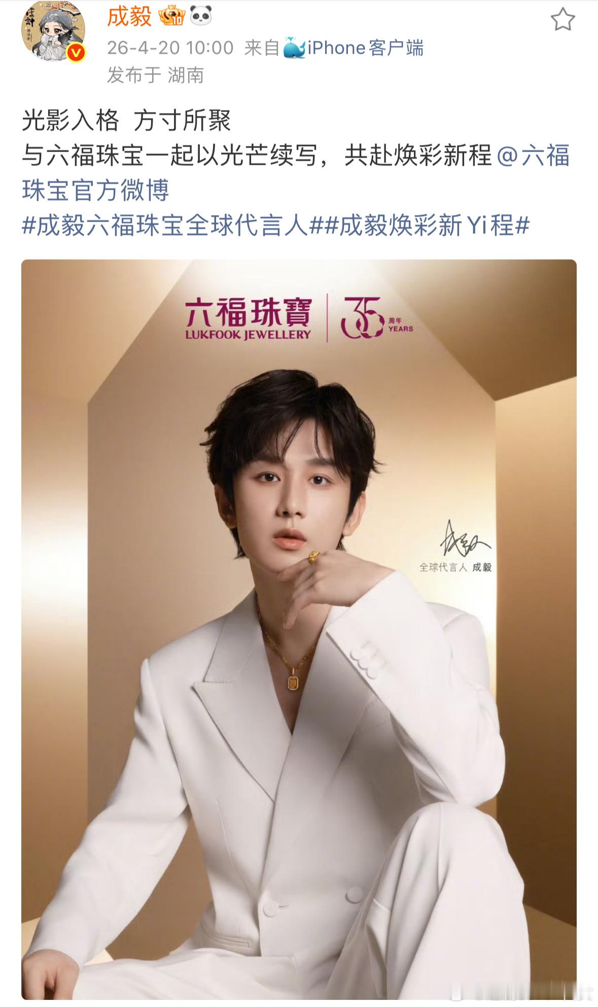 成毅六福珠宝全球代言人在六福珠宝35周年官宣续约,刚官宣新品直接买空,iejj手