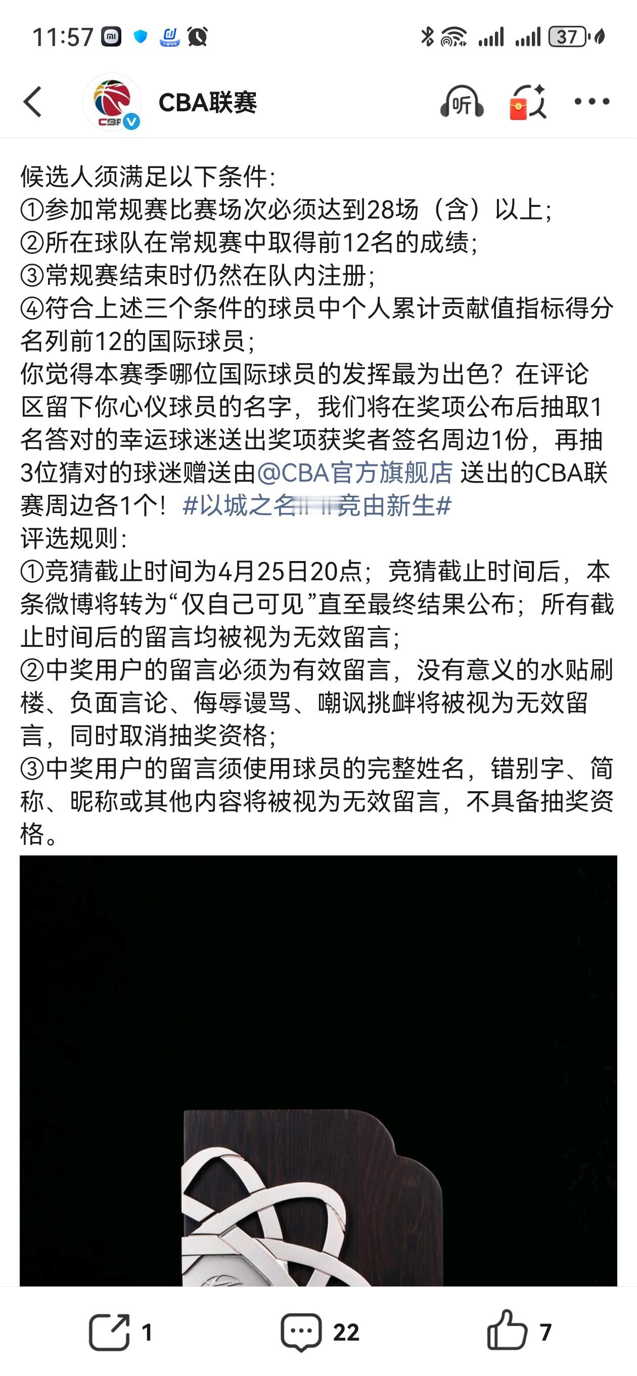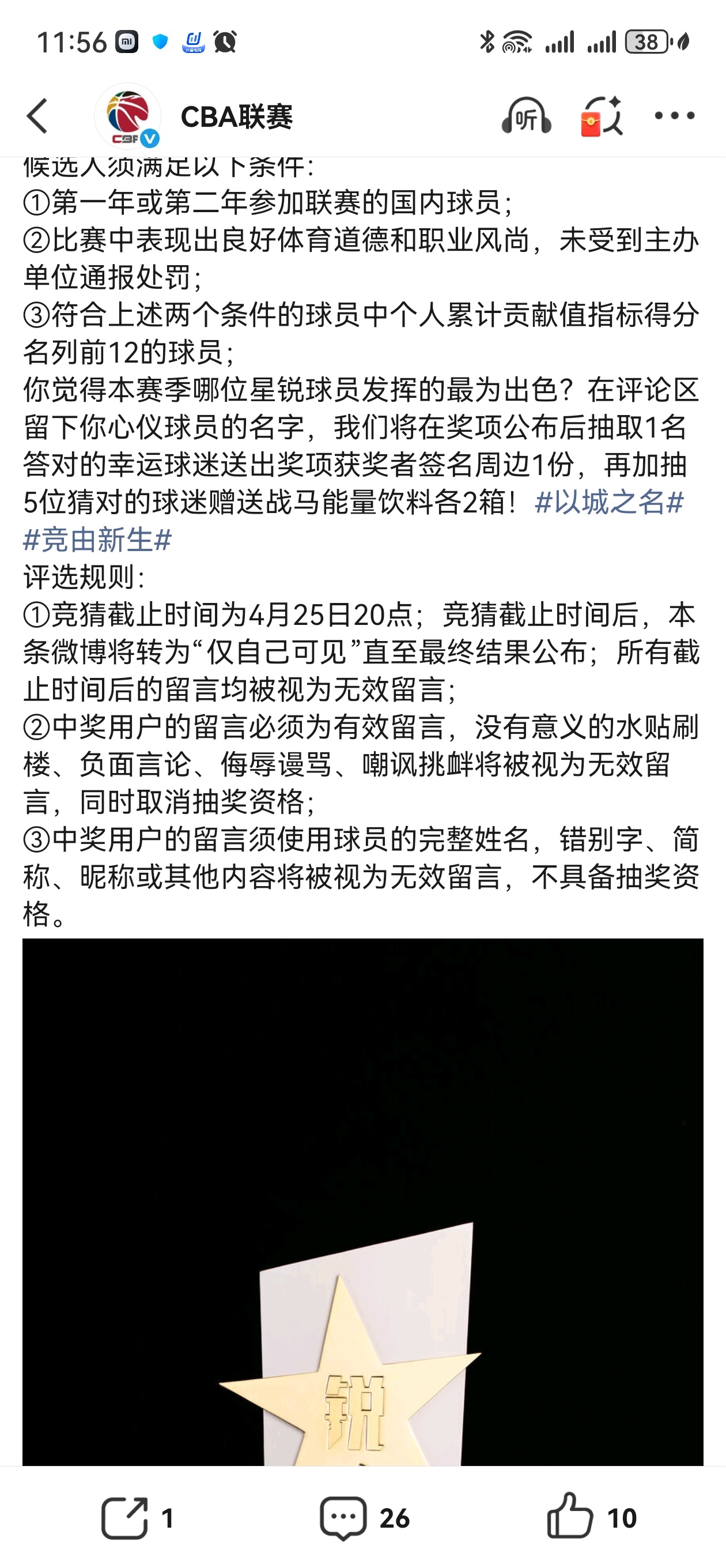 欢迎来到2025-2026赛季CBA联赛常规赛个人奖项竞猜活动!为每个奖项都设置了各项活动!快来赢取篮球周边!1:常规赛最有价值球员(我选胡金秋)2:常规赛最佳国际球员(我选塔克)3:卡特彼勒常规赛最佳防守球员4:沙特阿美最具进步球员5:最佳第六人6:战马年度最佳星锐球员7:国内球员第一阵容、第二阵容和最佳国际球员阵容8:最佳教练员(我选王博教练)本赛季常规赛将于4月24日落幕,常规赛各奖项评选活动也将于随后展开。根据赛季初期发布的《2025-2026赛季CBA联赛常规赛最有价值球员等奖项设置及评选办法》以城之名竞由新生