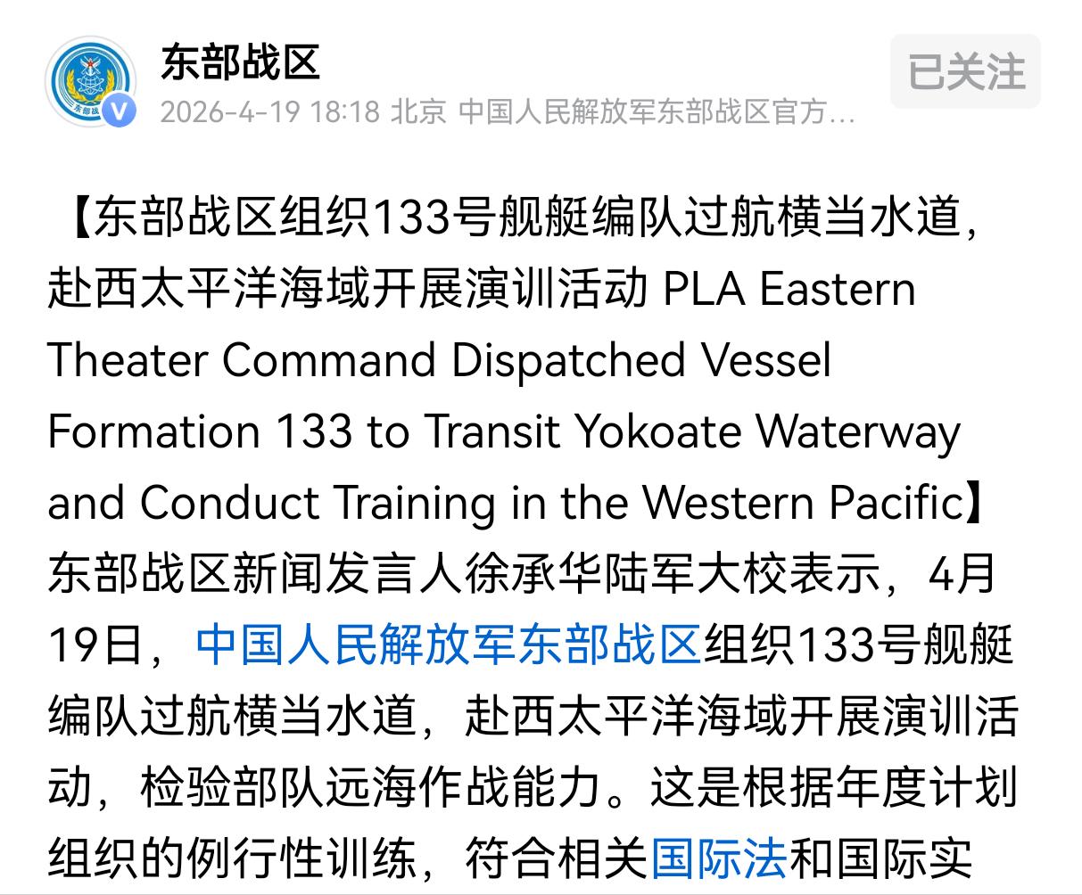 4月19日,东部战区新闻发言人徐承华陆军大校正式宣布,中国人民解放军东部战区组织133号舰艇编队顺利过航横当水道,赴西太平洋海域开展年度例行实战化演训,检验部队远海作战能力。