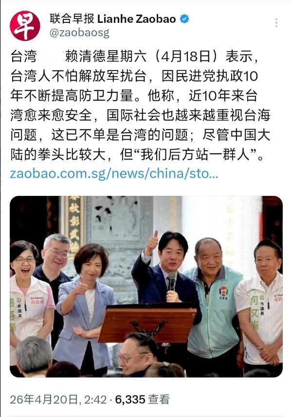新加坡联合早报今天(4月20日)报道:“赖清德星期六(4月18日)表示,台湾人不怕解放军扰台,因民进党执政10年不断提高防卫力量。他称,近10年来台湾愈来愈安全,国际社会也越来越重视台海问题,这已不单是台湾的问题;尽管中国大陆的拳头比较大,但‘我们后方站一群人’。”