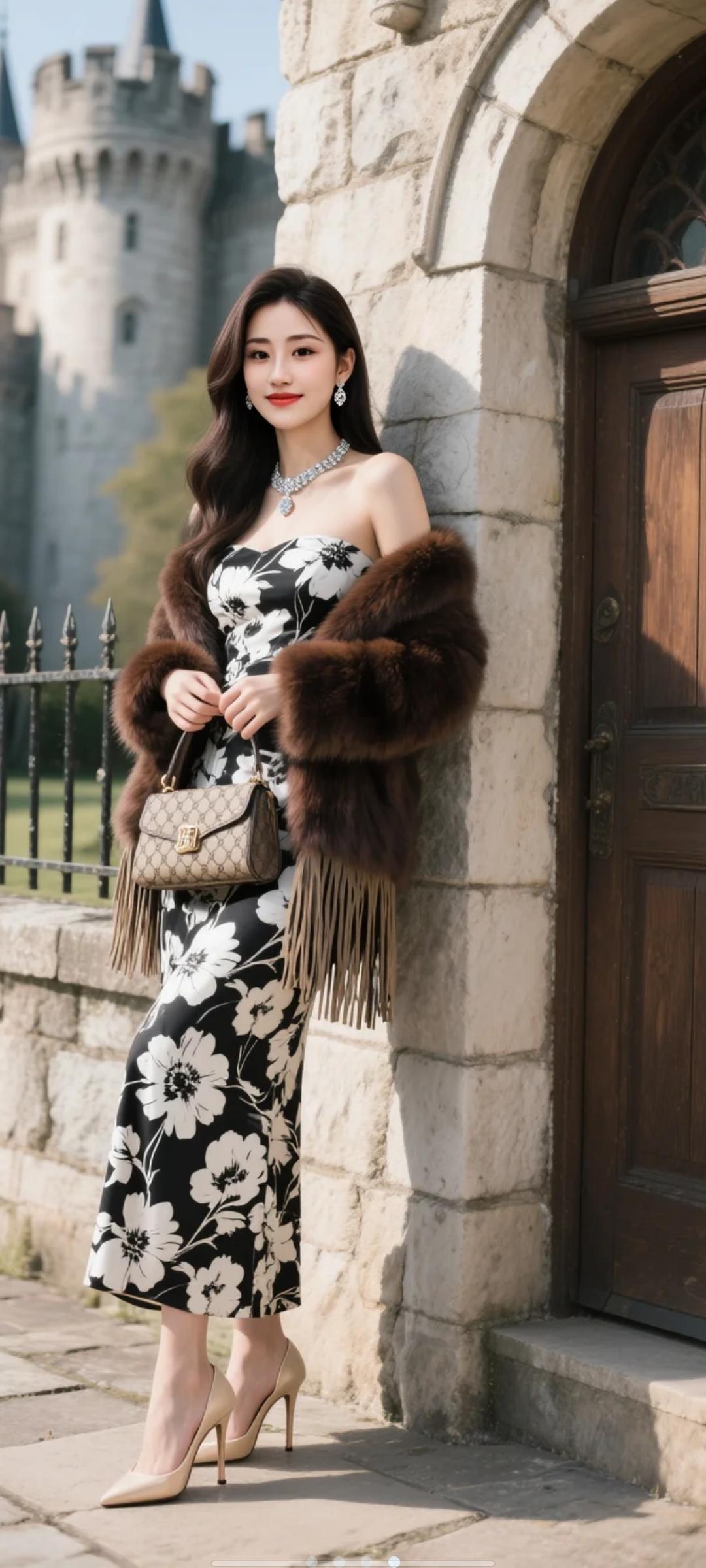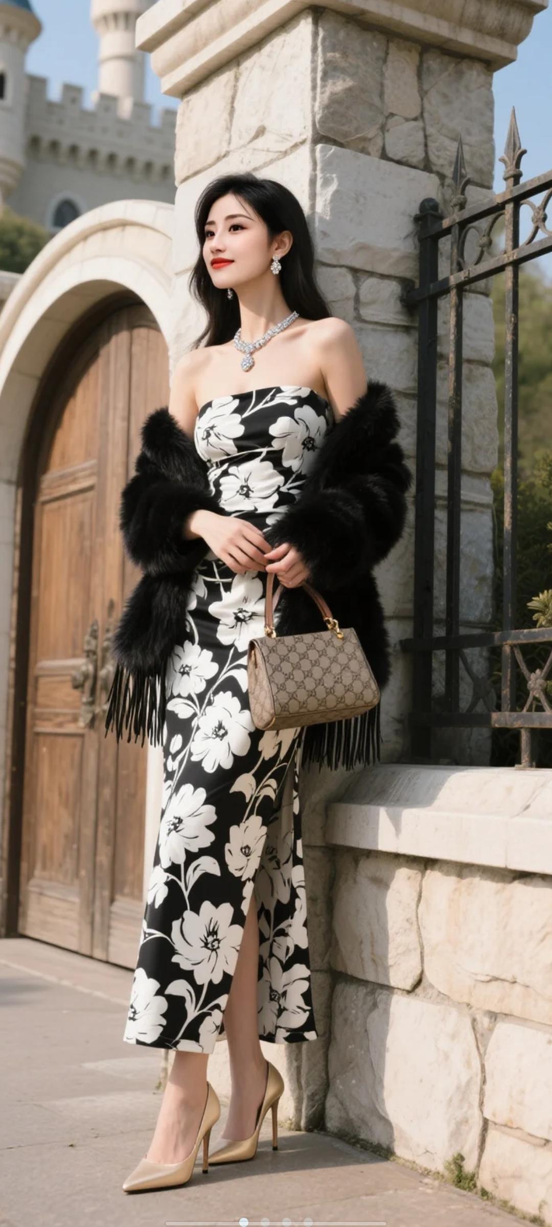 梦幻城堡前,优雅黑裙与毛绒外套的完美搭配,尽显时尚与浪漫。
