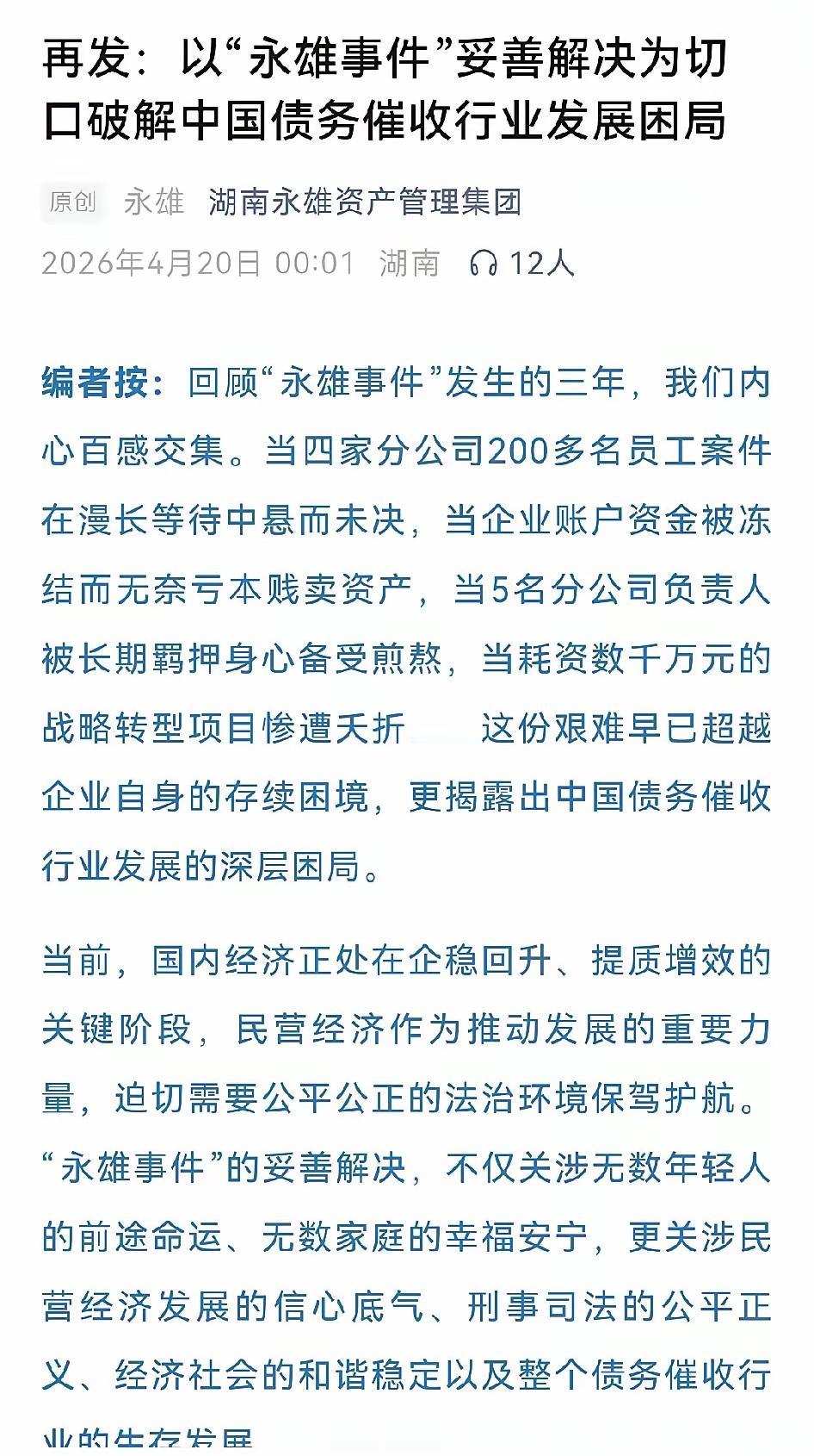近期,曾因大规模违法催收被查处的湖南永雄资产管理集团(下称 “永雄公司”)及个别支持者,借网络公开 “喊冤卖惨”,将企业涉刑案件拔高为 “事关民营经济信心、司法公平、青年前途、家庭幸福” 的宏大叙事,试图混淆视听、博取同情。这种为违法催收企业 “招魂” 的言论,既违背司法实践与法律底线,也与社会主义核心价值观格格不入,更无视近年来暴力、软暴力催收酿成的无数人间悲剧,必须予以严厉驳斥。