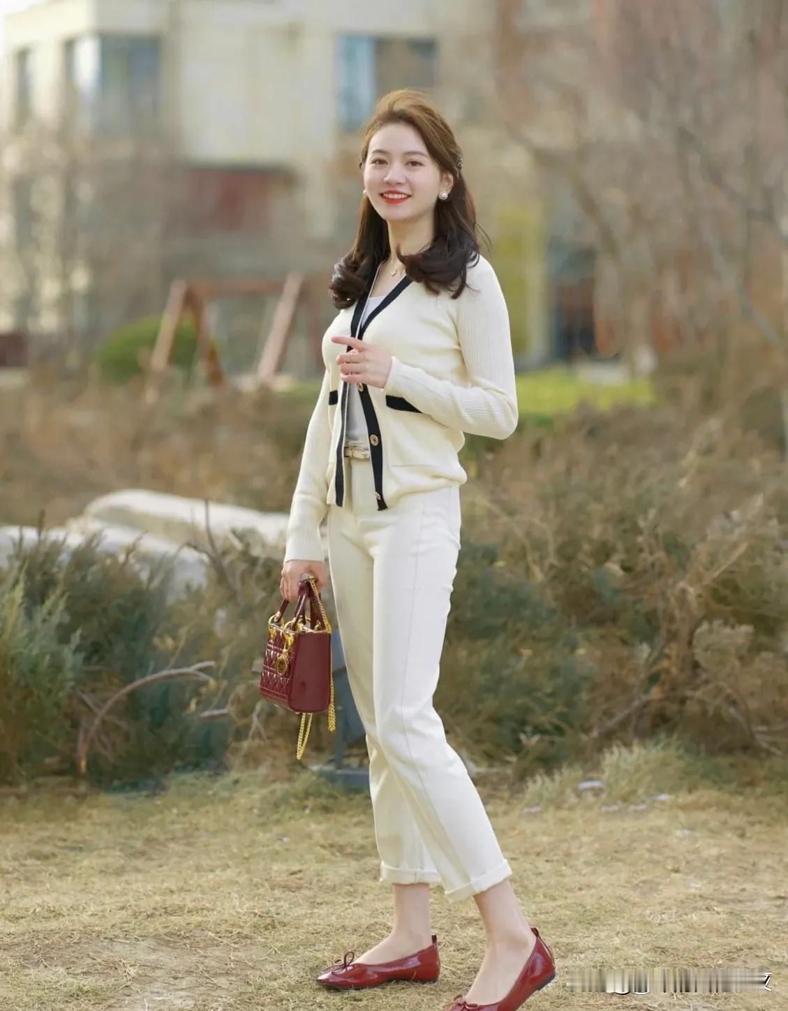 秋日公园是展现优雅穿搭的绝佳场所。想走温柔学姐风,内搭米色细肩带背心显白修身,下