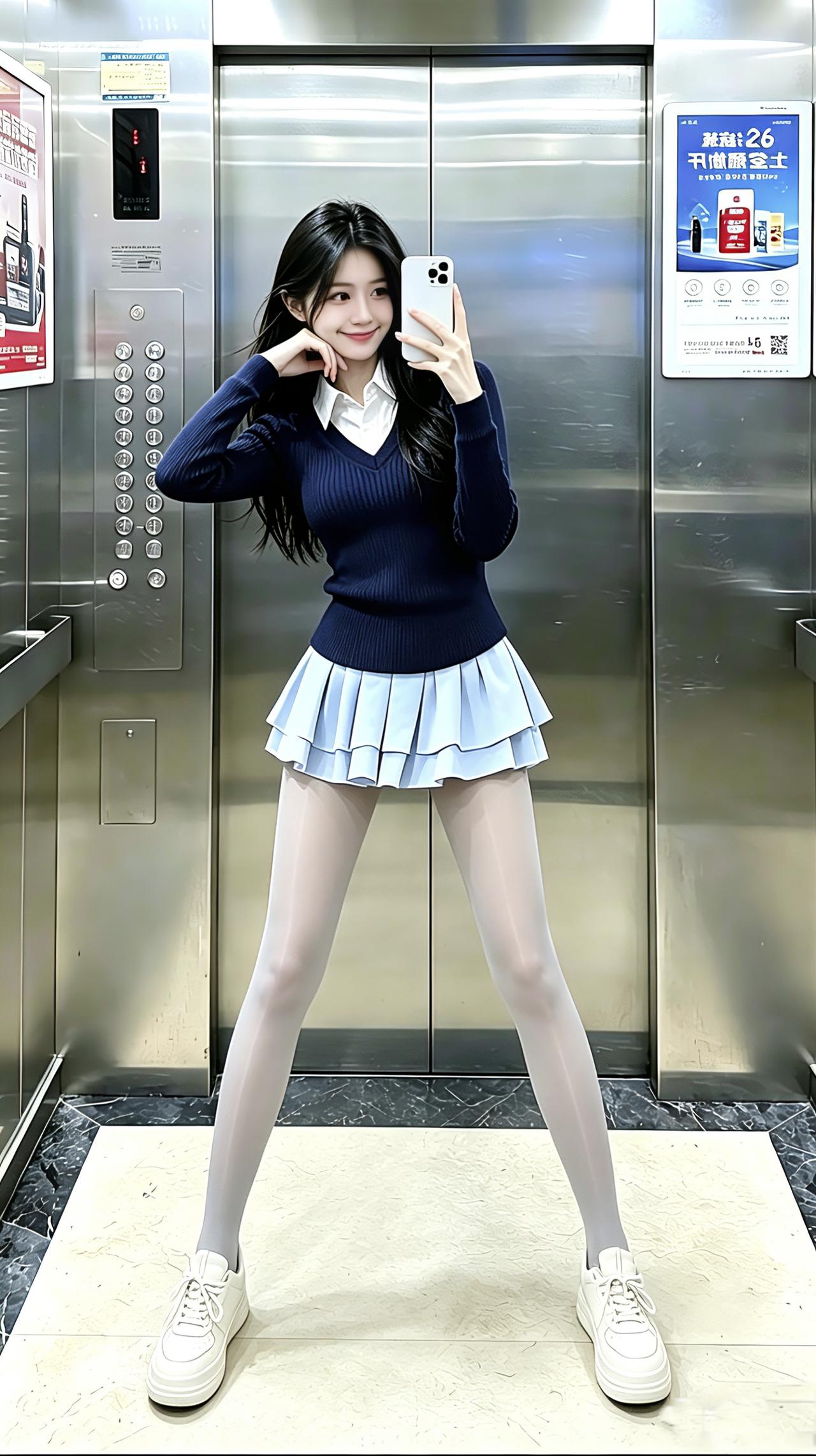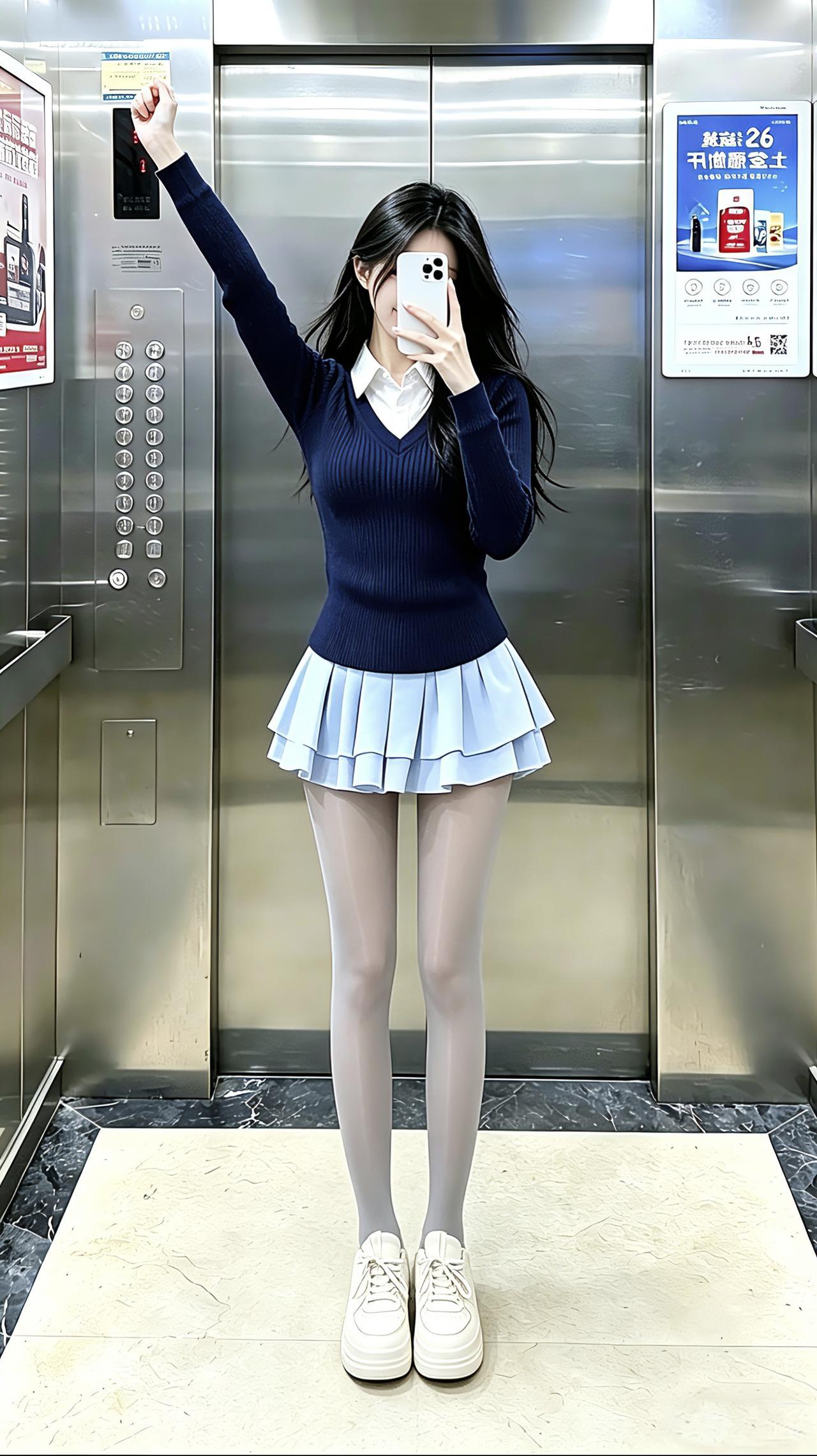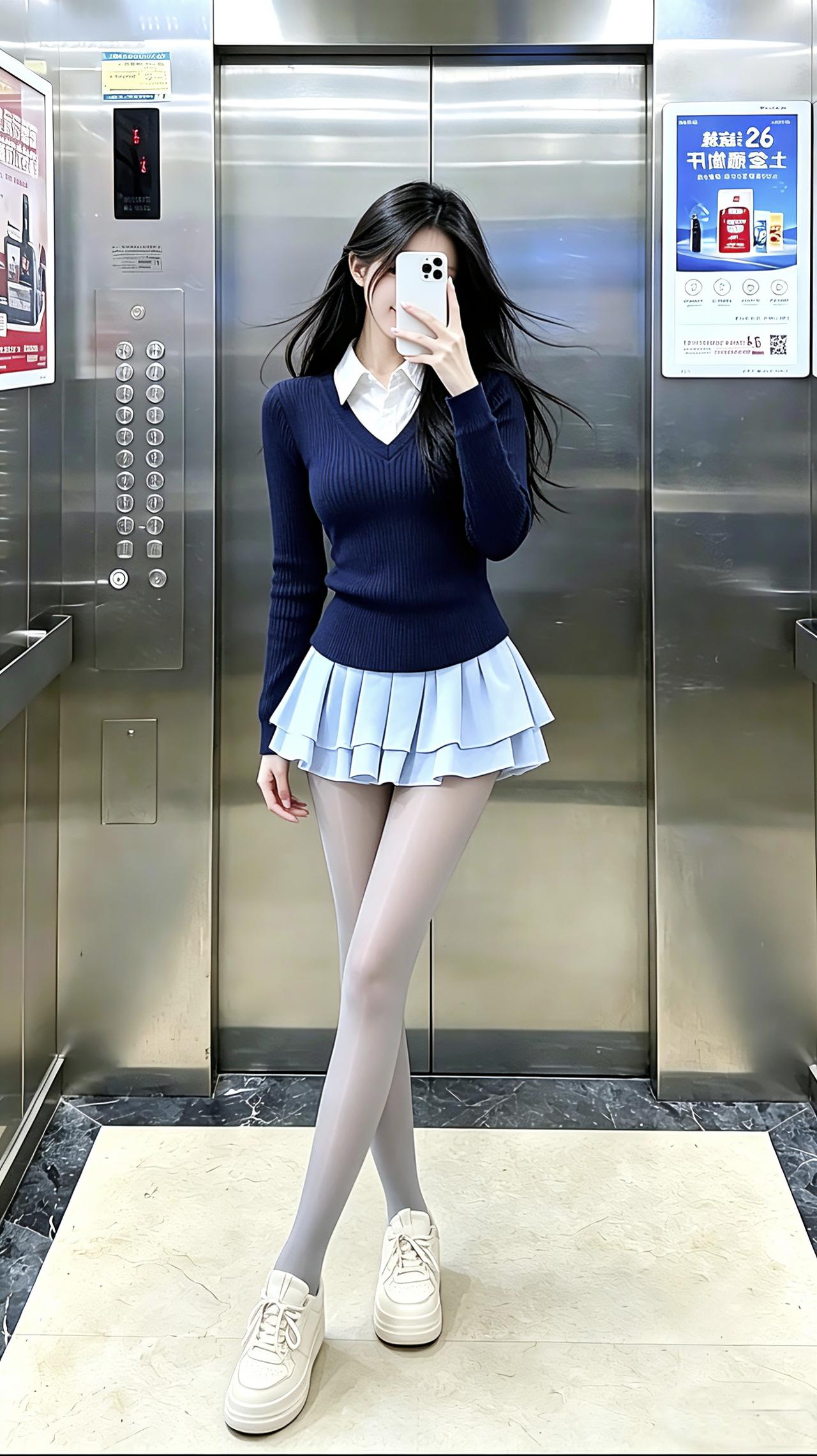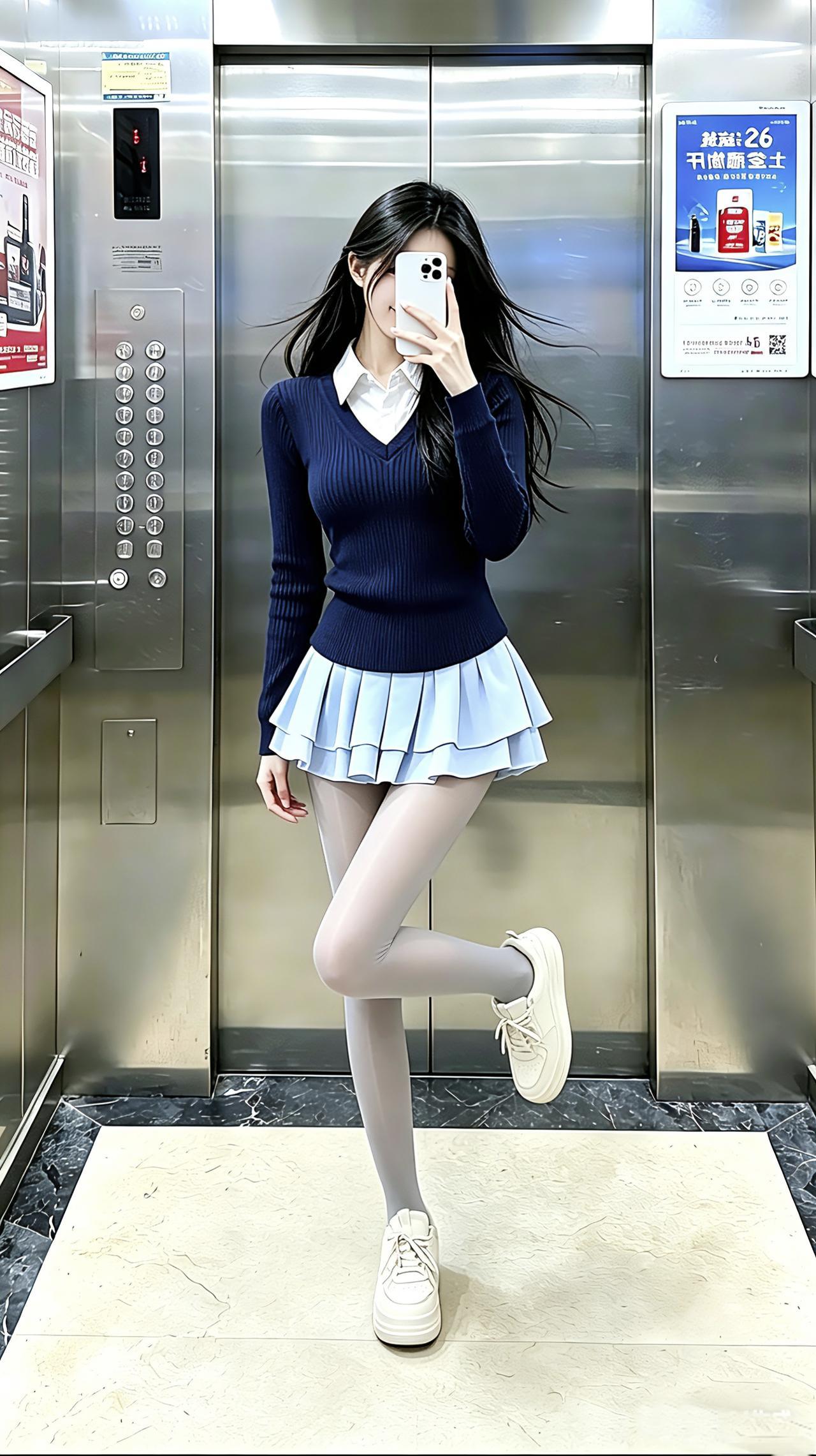 这种学院甜妹风你们爱了吗?电梯间里,藏白衬衫的藏蓝毛衣裹着学院乖甜,浅蓝百褶裙一