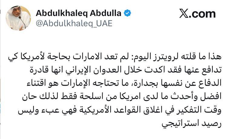 阿联酋总统顾问阿卜杜勒哈利克·阿卜杜拉公开喊话:是时候考虑关闭美国在阿联酋的军事基地了。
