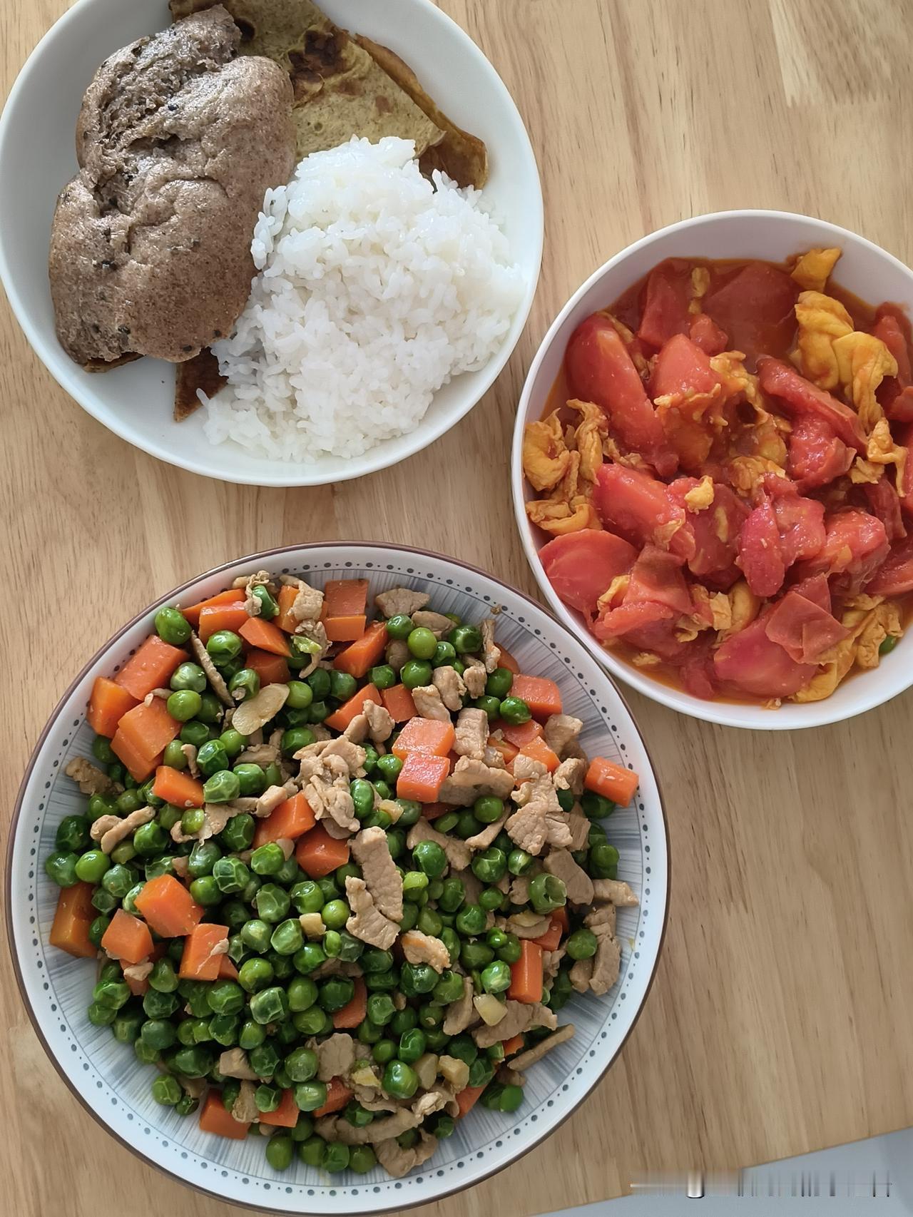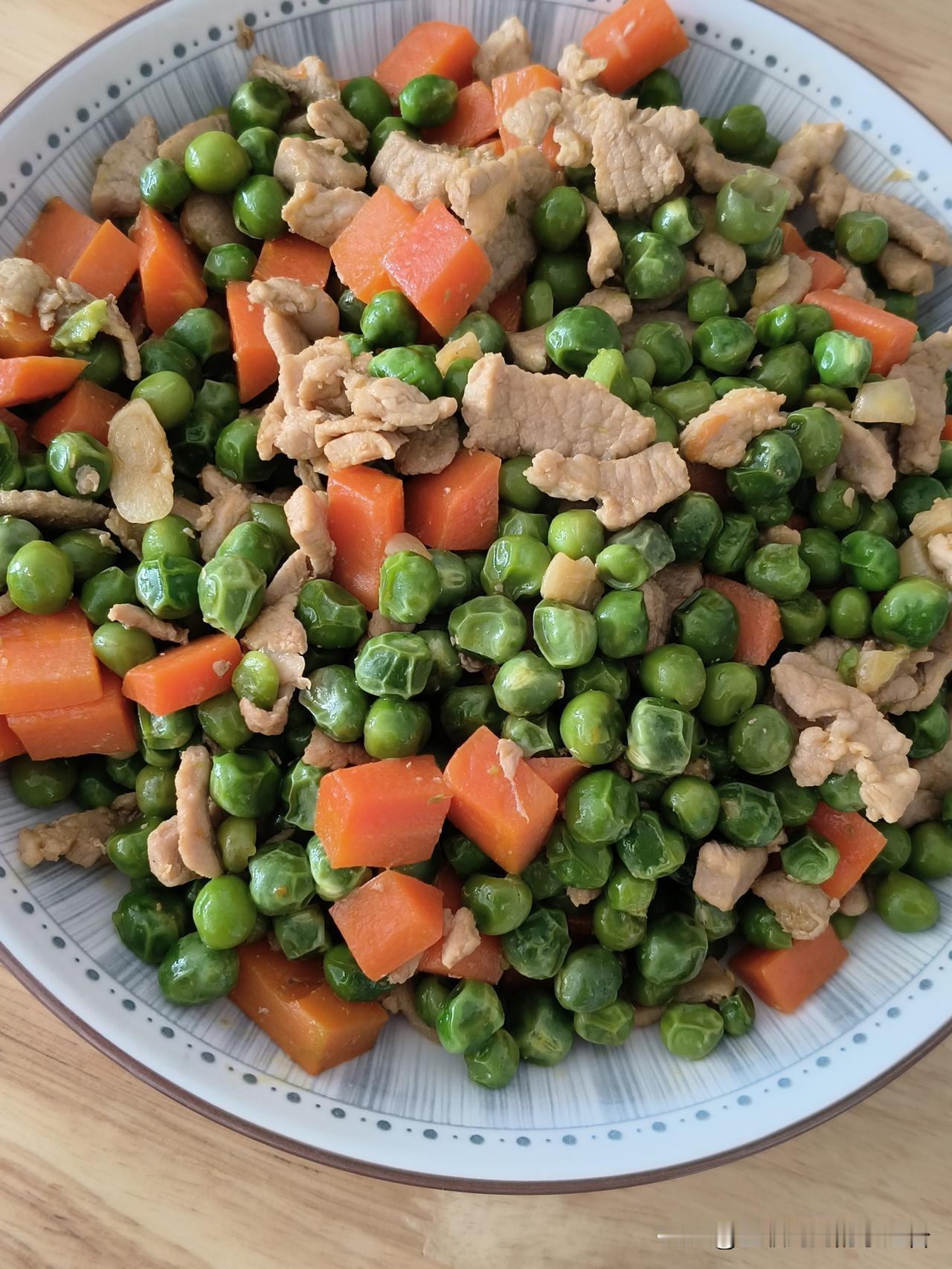 我说,今天赶时间,西红柿就没有来得及去皮,豌豆里的肉我寻思切小块你也爱吃呢。