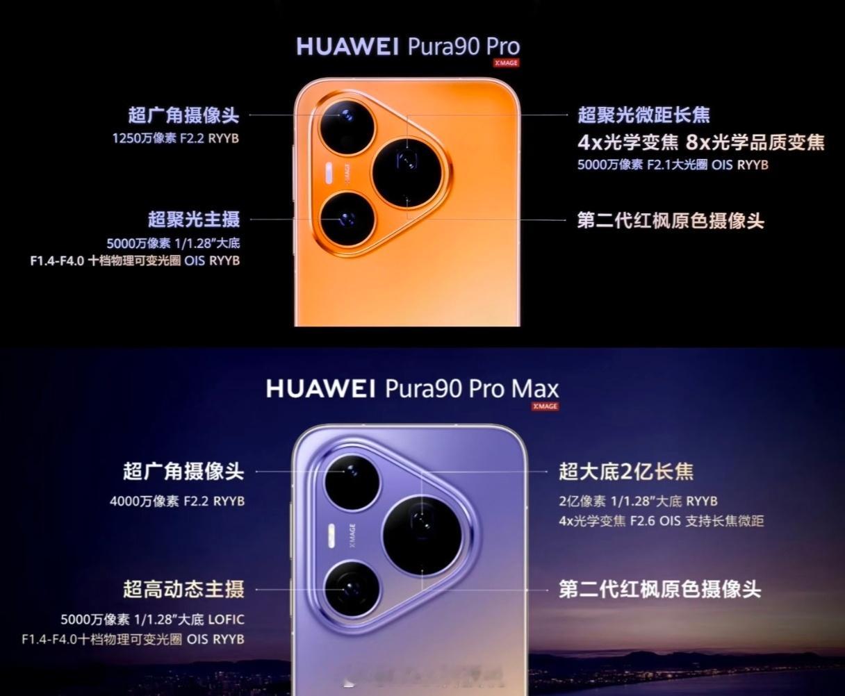 Pura90 Pro系列的镜头配置,Max的1英寸主摄退场,1/1.28英寸2亿像素潜望长焦,4X光学变焦