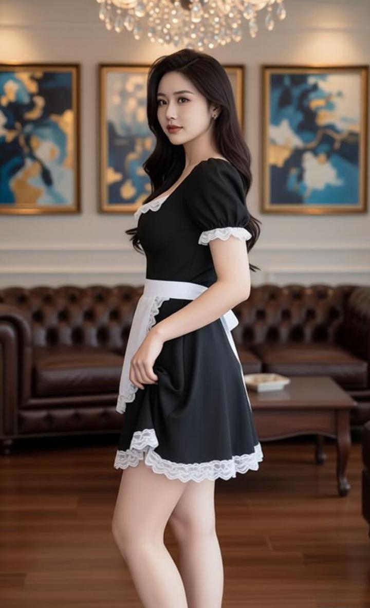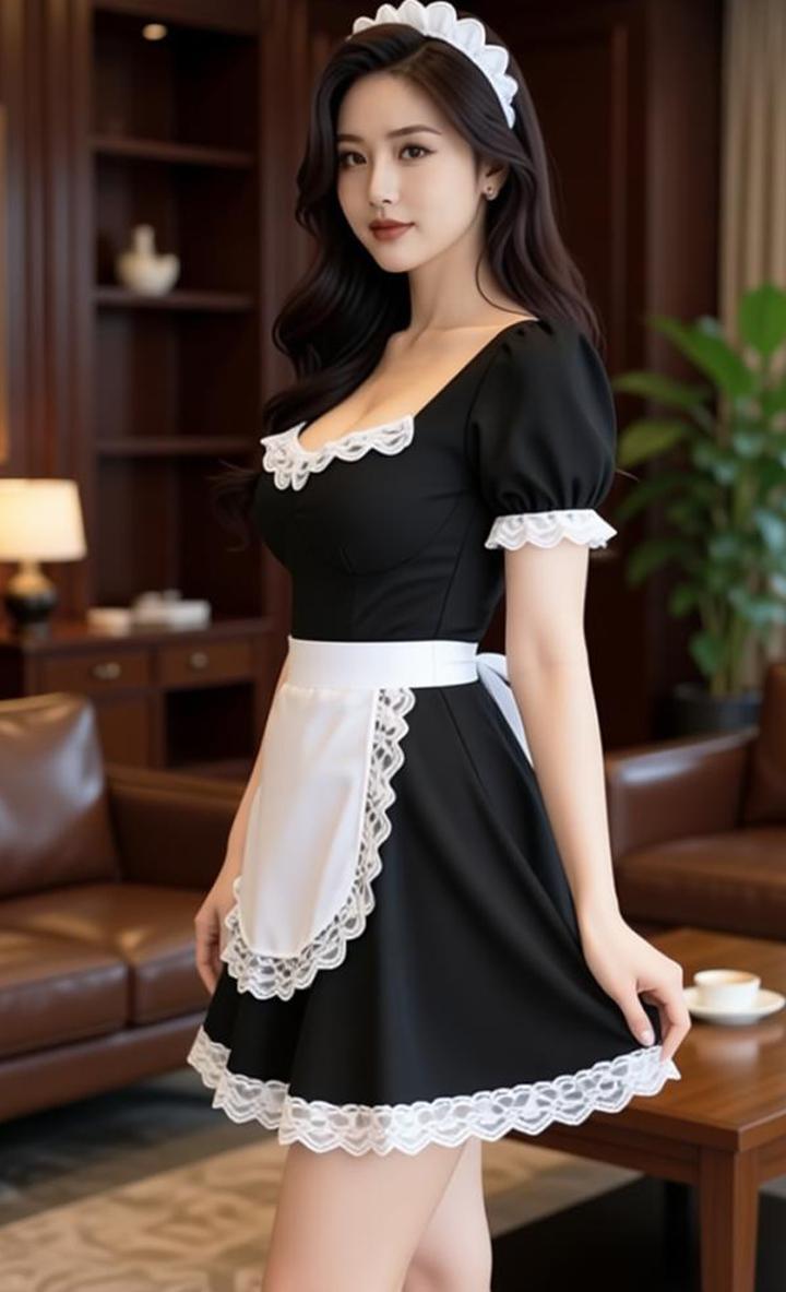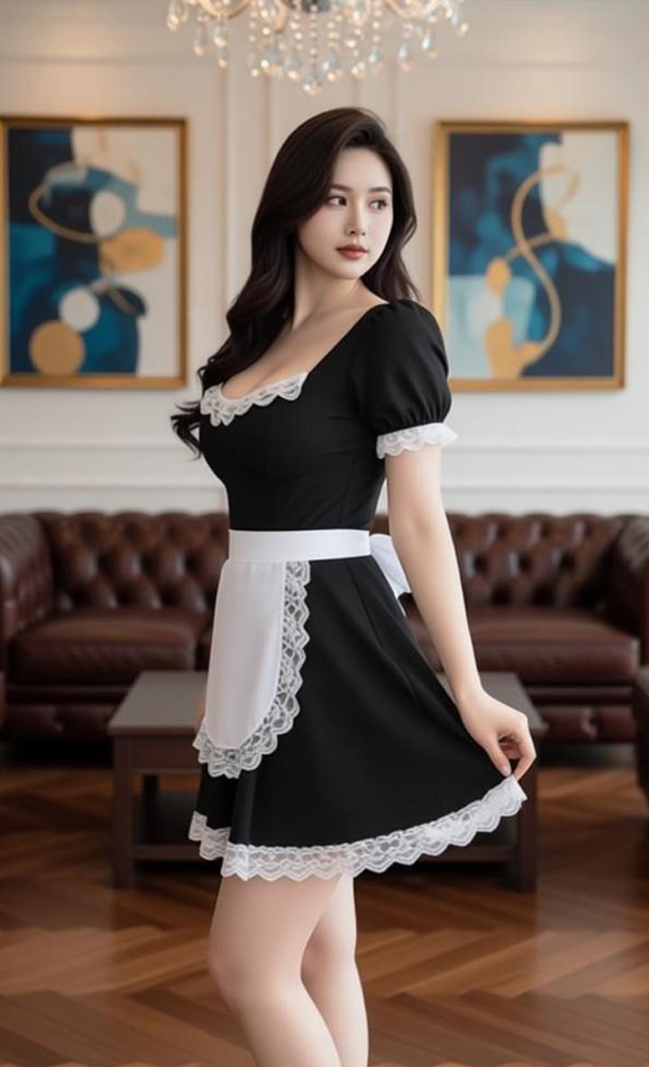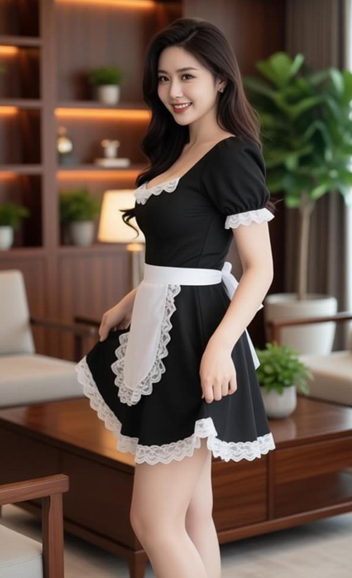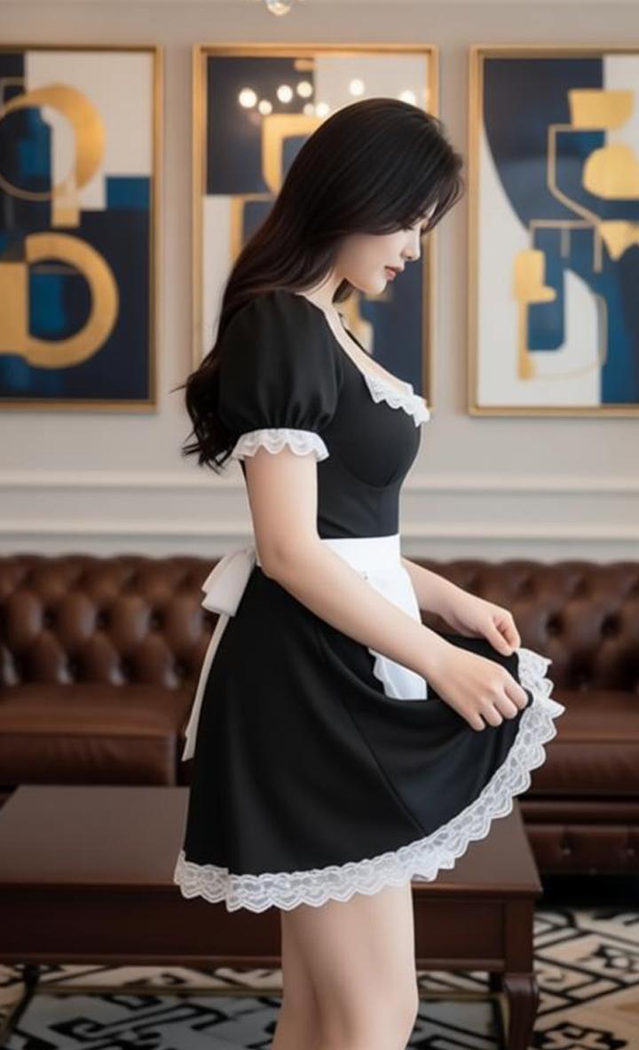 顾以宁小姐姐身材真是没得说,瞧瞧这身经典女仆装,黑裙配白蕾丝,泡泡袖加系带围裙,复古又俏皮!长发柔顺披肩,站在温馨客厅里,甜美的笑容瞬间拉满氛围感,温柔又灵动,让人一眼就心动!