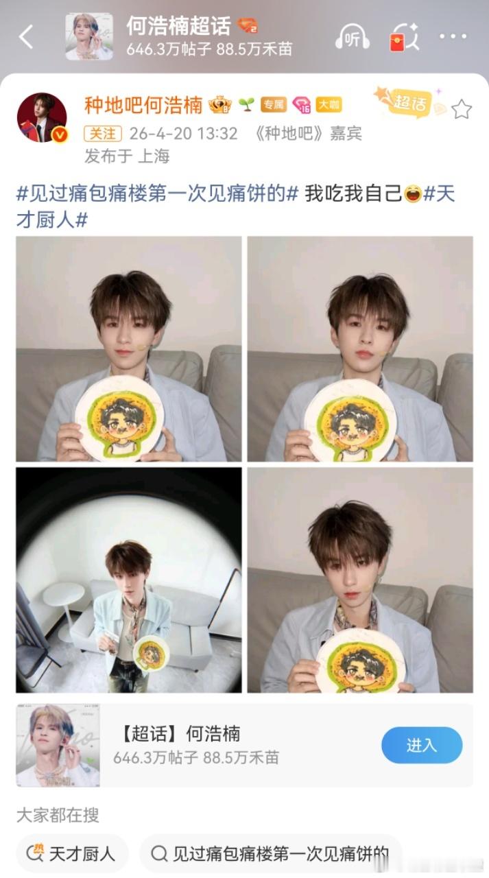 何浩楠我吃我自己 吃自己痛饼实录有!小何今天录制《天才厨人》,收到了节目组赠送的痛饼,见过痛包、痛楼,还是第一次见痛饼~看到小何分享的痛饼合照,图里有一个人和一个饼很萌!