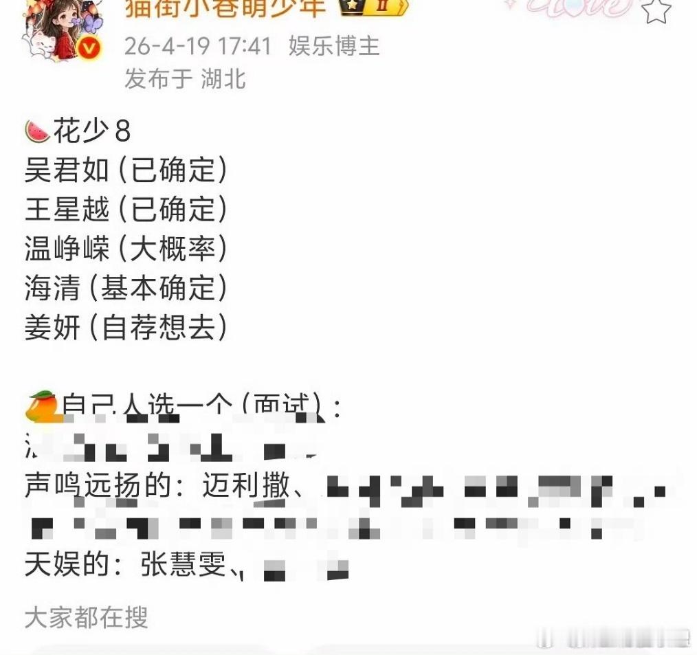 曝张慧雯已面试花少网传张慧雯面试花少 气质出众性格讨喜,能玩能闹又细心稳重,吃苦耐劳不娇气,完美契合户外旅行综艺的调性!
