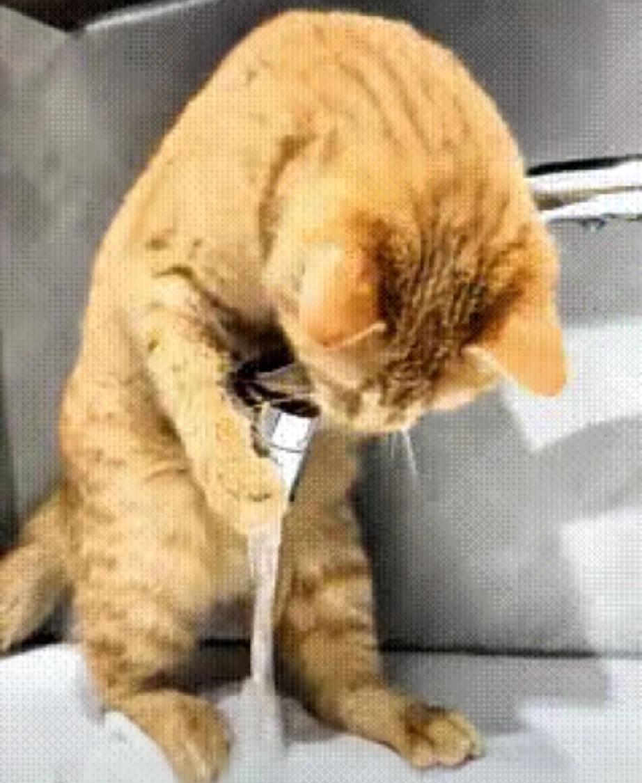 又是用爪子死命堵水流,又是拼命往下压水龙头把手,一顿手忙脚乱,水却越流越凶,急得原地打转,那慌张又无助的样子简直太萌了。