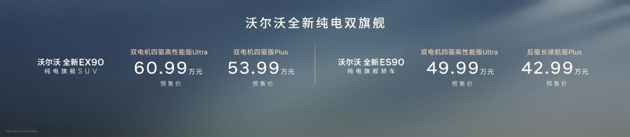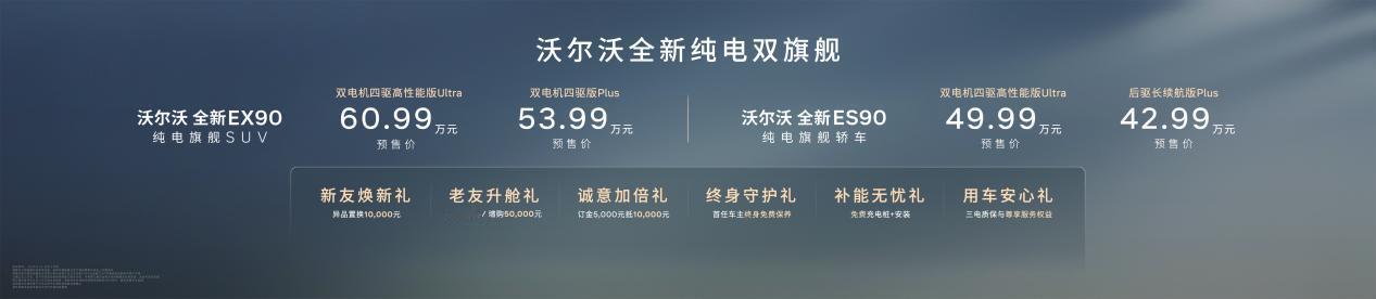 4月15日,在沃尔沃汽车99周年庆典暨新品发布会上,同步推出多款重磅新品,其中,全新纯电旗舰 SUV EX90 及纯电旗舰轿车 ES90 正式开启预售,EX90 预售价 53.99 万元起(双电机四驱高性能版 Ultra 60.99 万元),ES90 预售价 42.99 万元起(双电机四驱高性能版 Ultra 49.99 万元);全新 XC70 99 周年感恩版同步上市,限时参考尊享价 24.99 万元(Core 版)和 26.99 万元(Plus 版),三款车型均搭配专属预订及购车权益,回馈用户长期信赖。