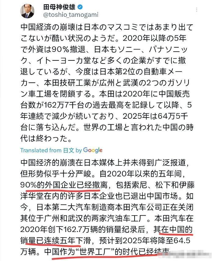 消息刚出来不到24小时,田母神俊雄就迫不及待地跳出来,在媒体上高调宣称 “中国时代已然终结”,还添油加醋地说中国经济已经崩溃,外资大规模撤离,试图把这笔军售和中国经济强行绑在一起,显得日本多厉害似的。