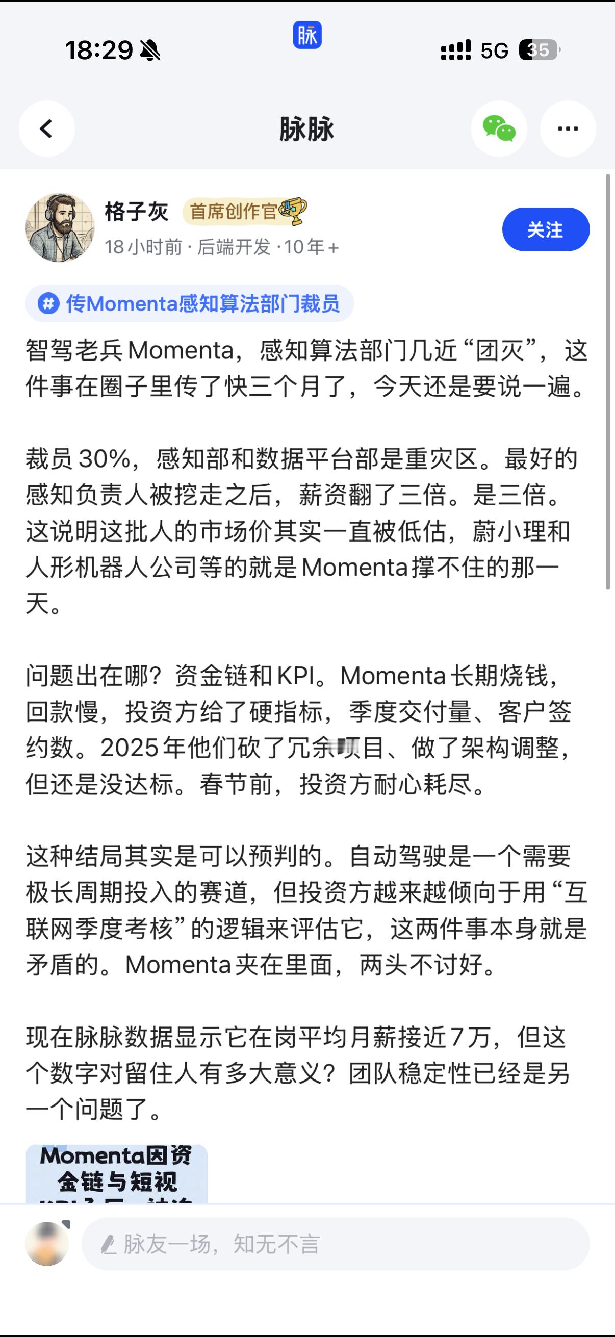 emmm,脉脉上在传言Momenta在裁感知智驾体验新能源大牛说