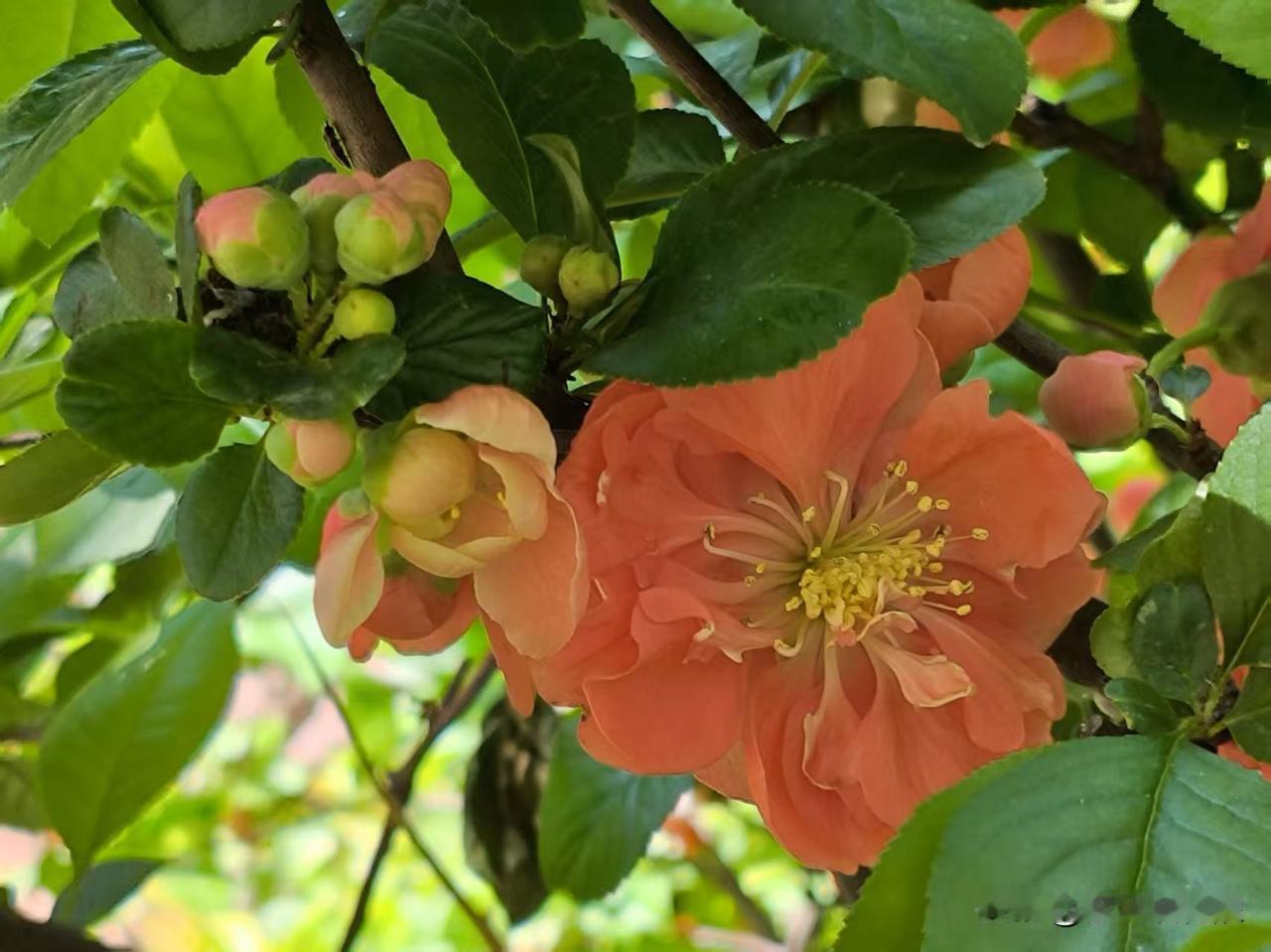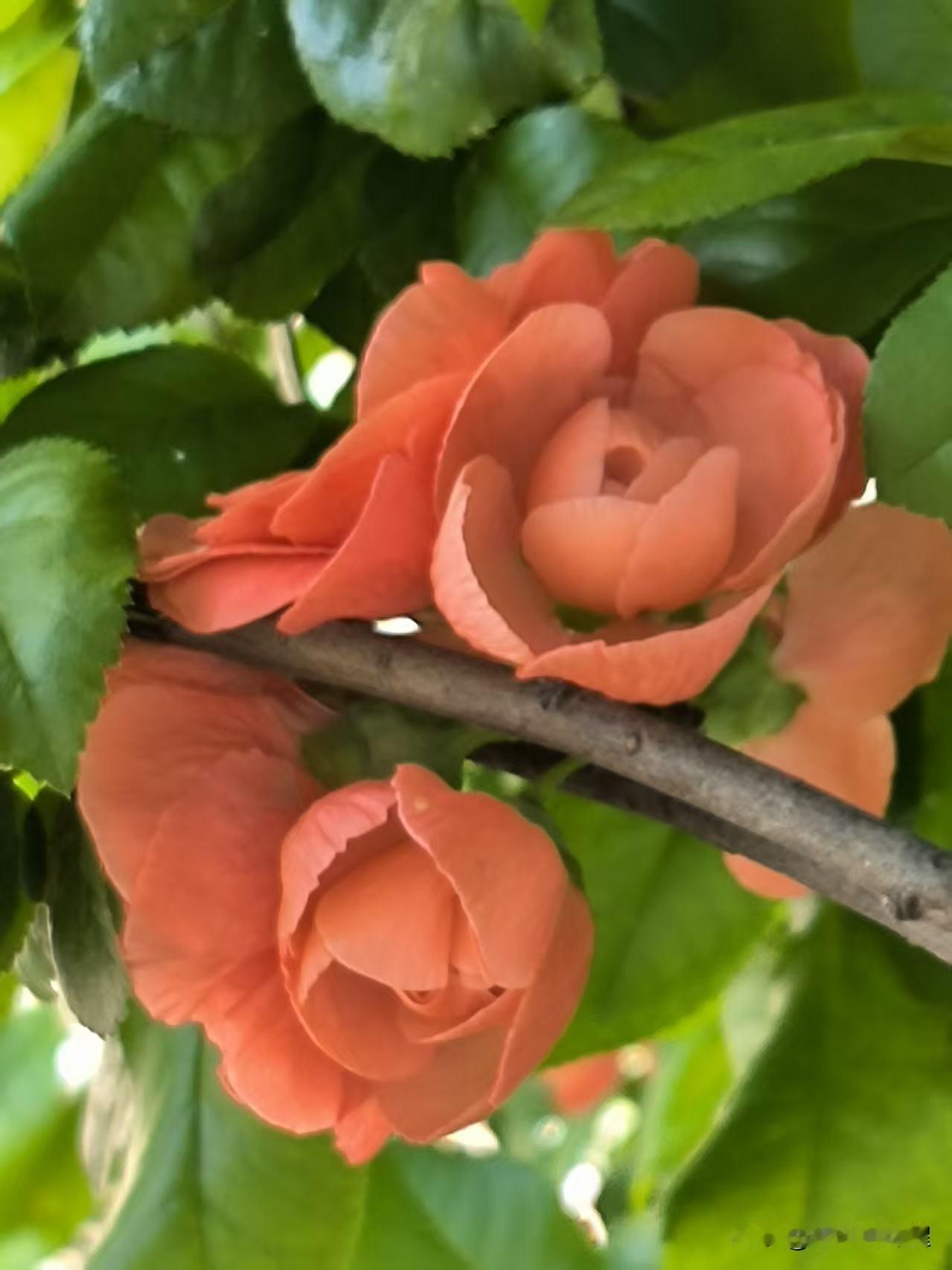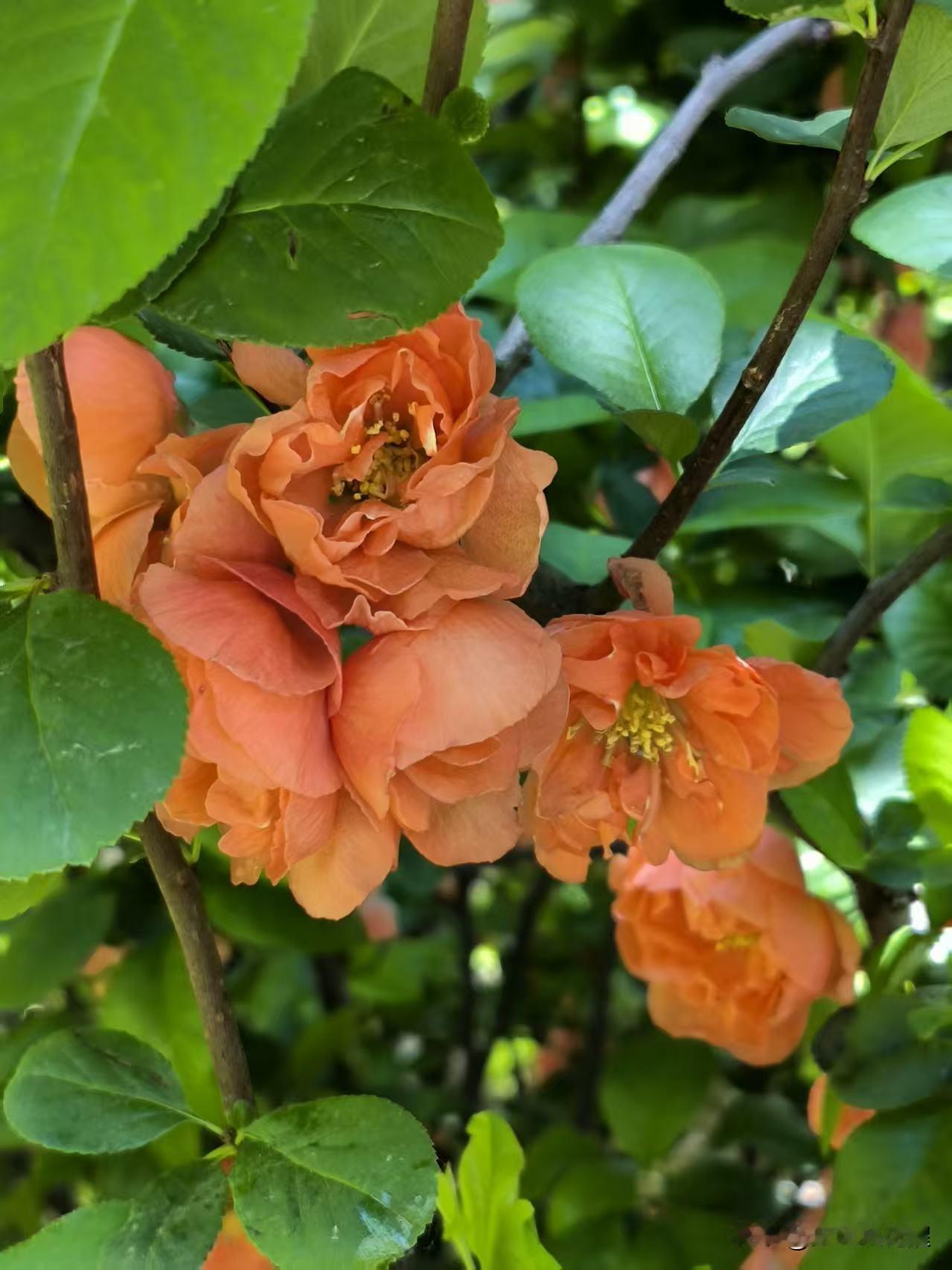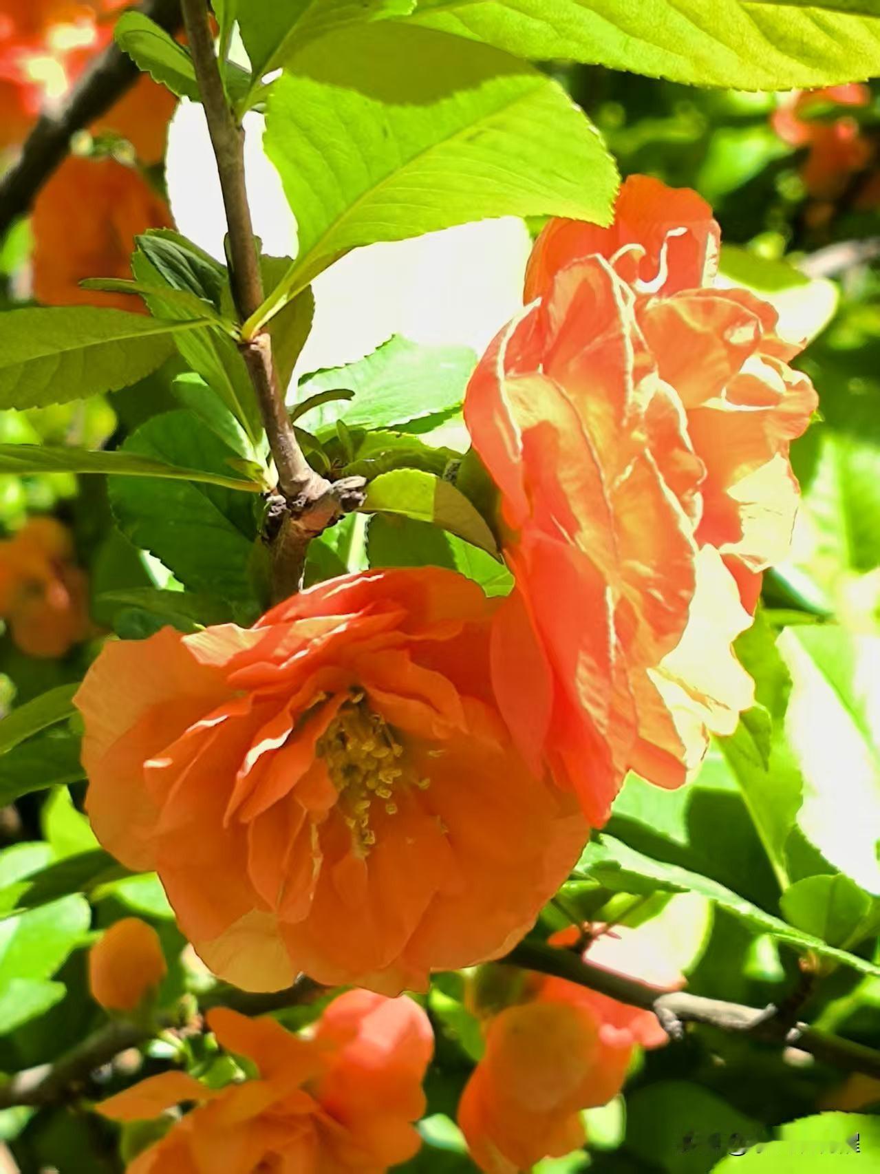 喜欢拍解放北园的贴梗海棠,花朵开的特别大,颜色鲜艳,红红火火的在枝条上绽放,看着