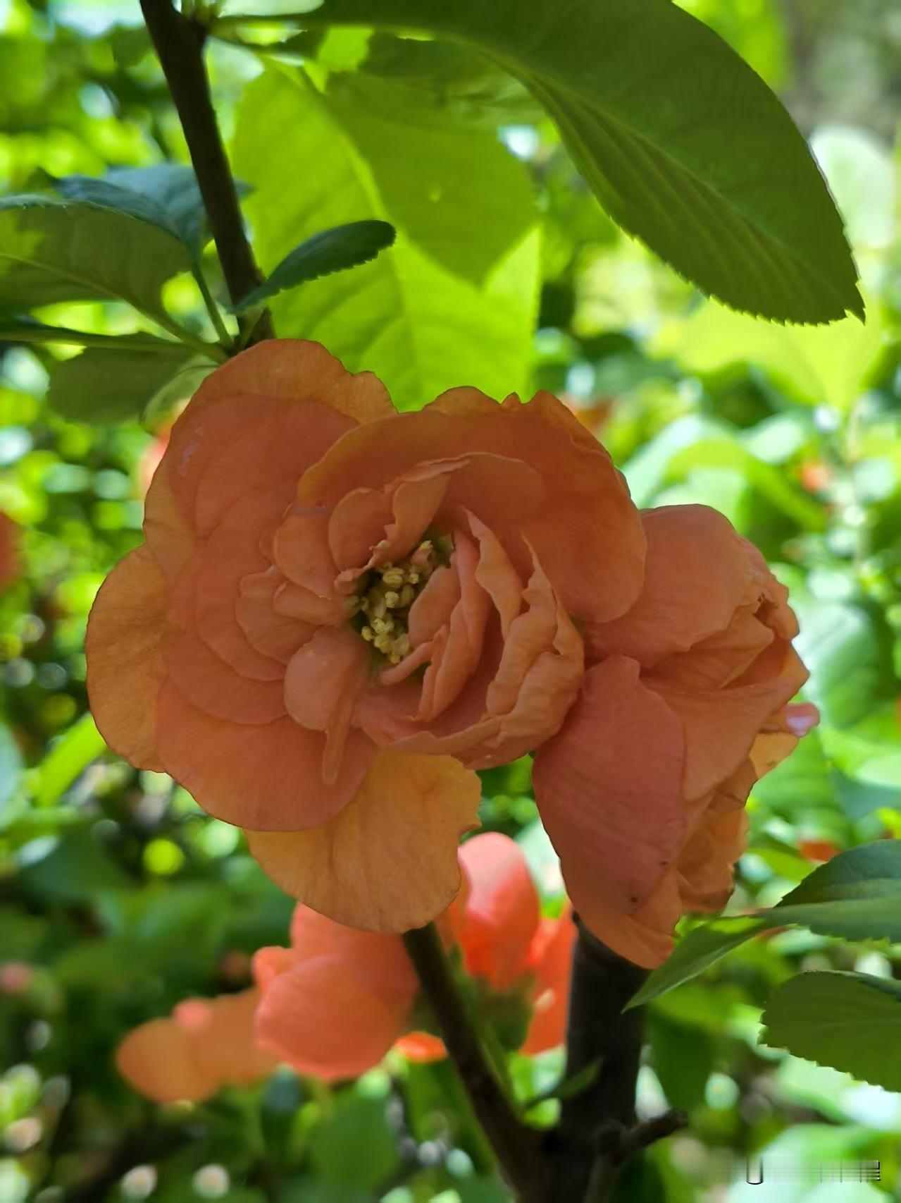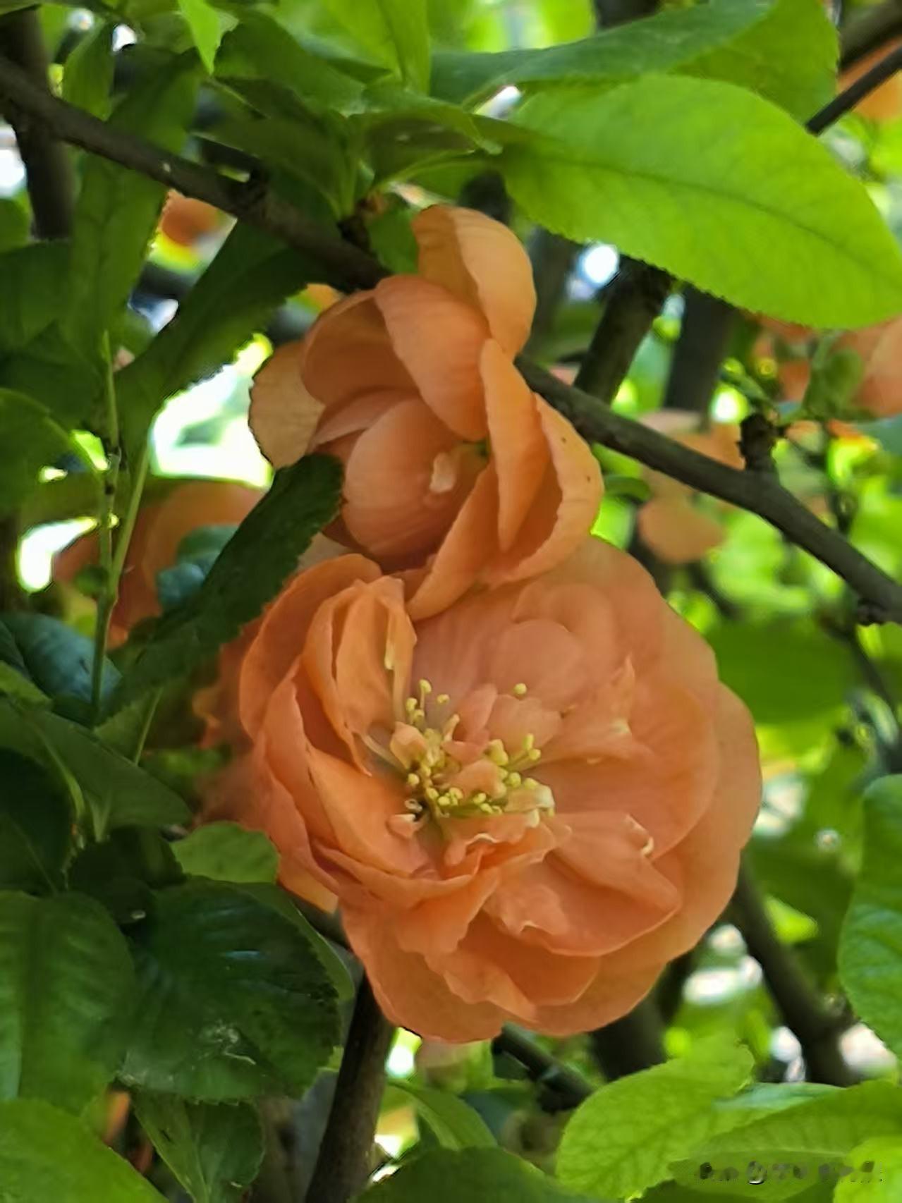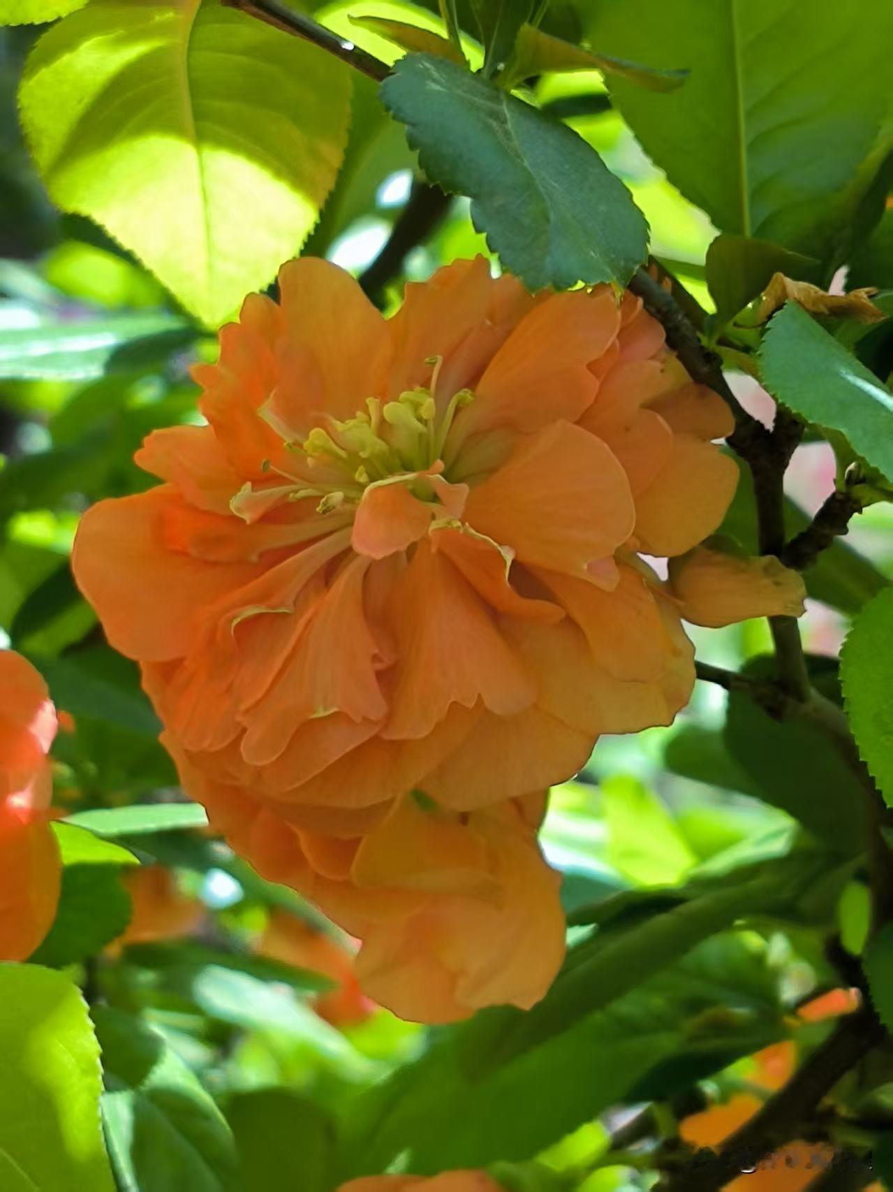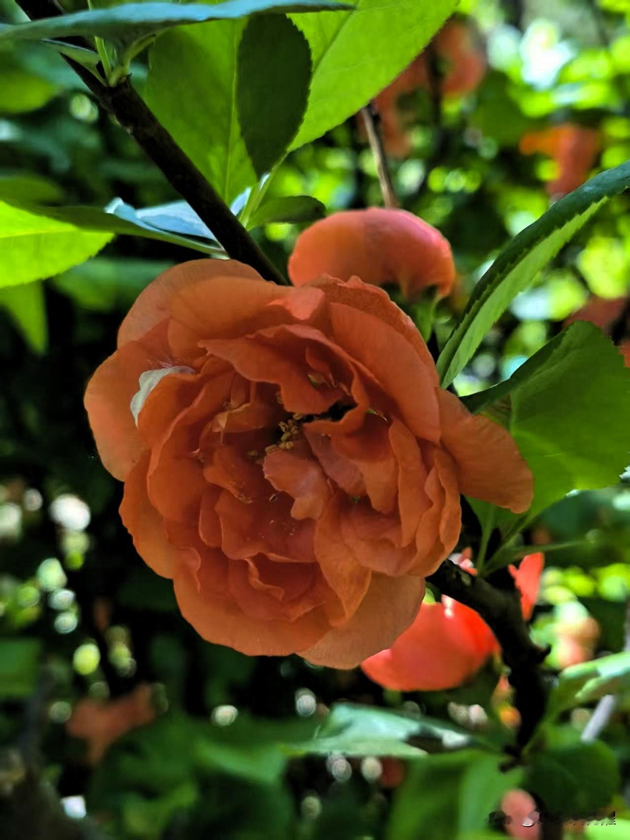 喜欢拍解放北园的贴梗海棠,花朵开的特别大,颜色鲜艳,红红火火的在枝条上绽放,看着