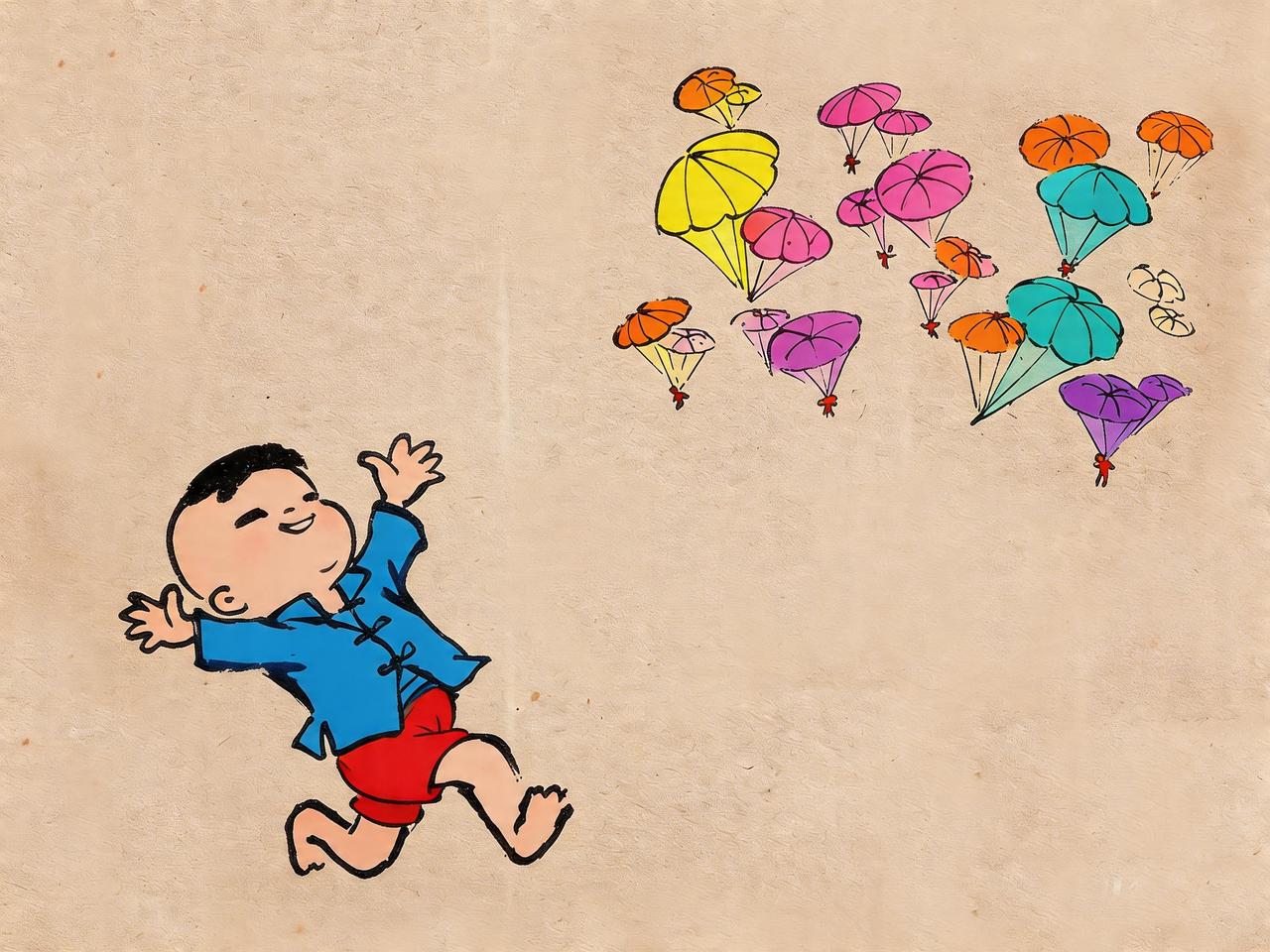 构图简单稚拙,笔触松弛温暖,把上世纪五六十年代孩童的天真烂漫、市井与海边的烟火氛围,完整留存了下来。