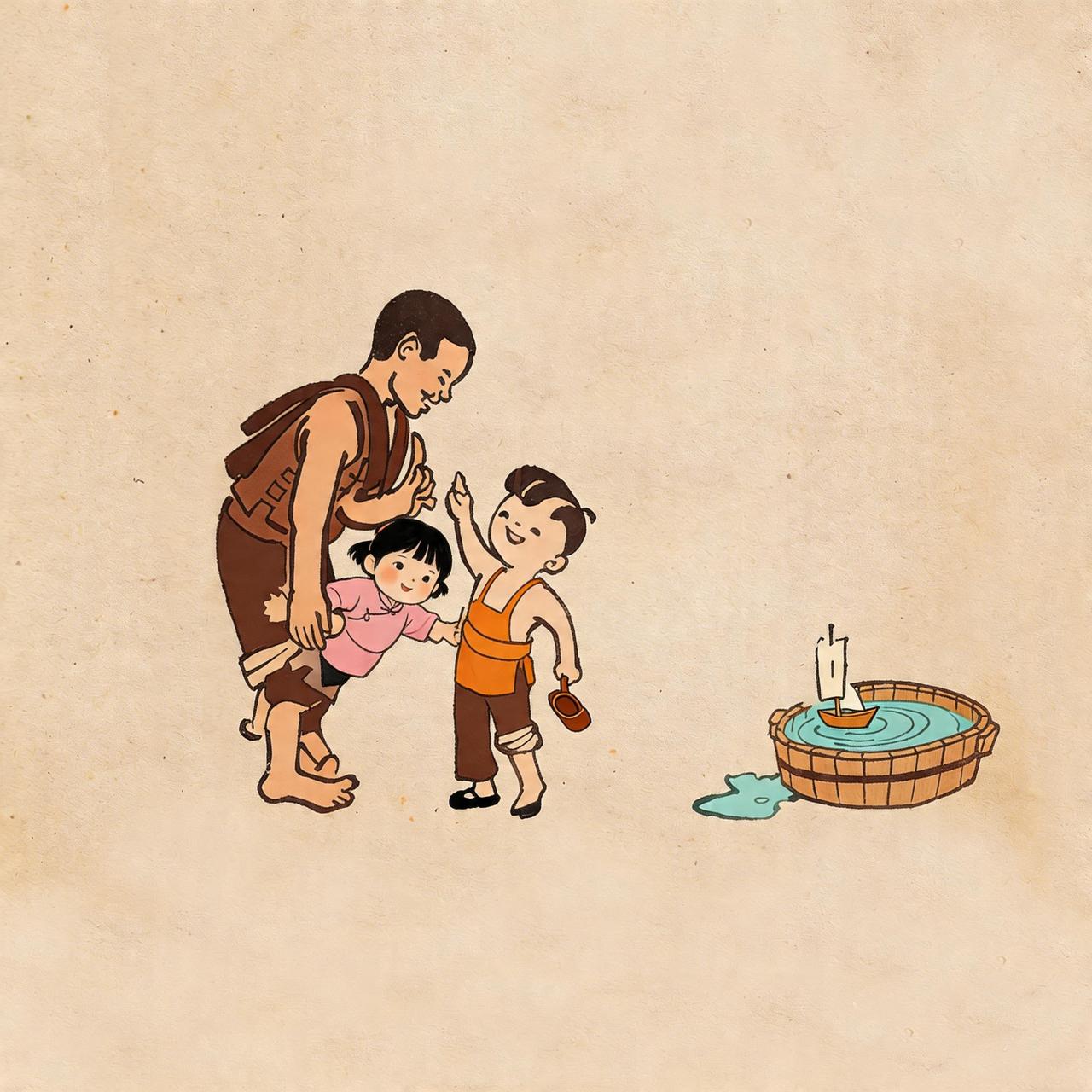 渔家儿女补织渔网、门前嬉戏、夏日抱瓜、檐下看云、放金鱼风筝、和小猫玩耍、帮家里劳动…