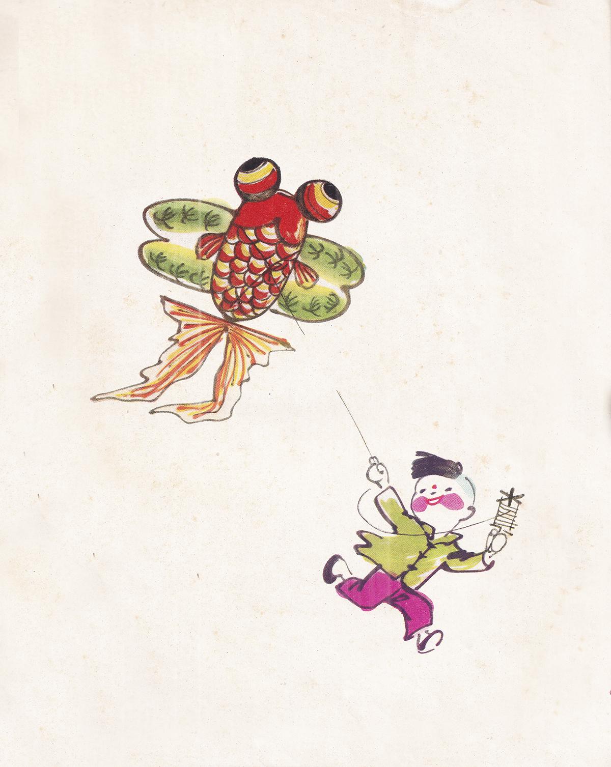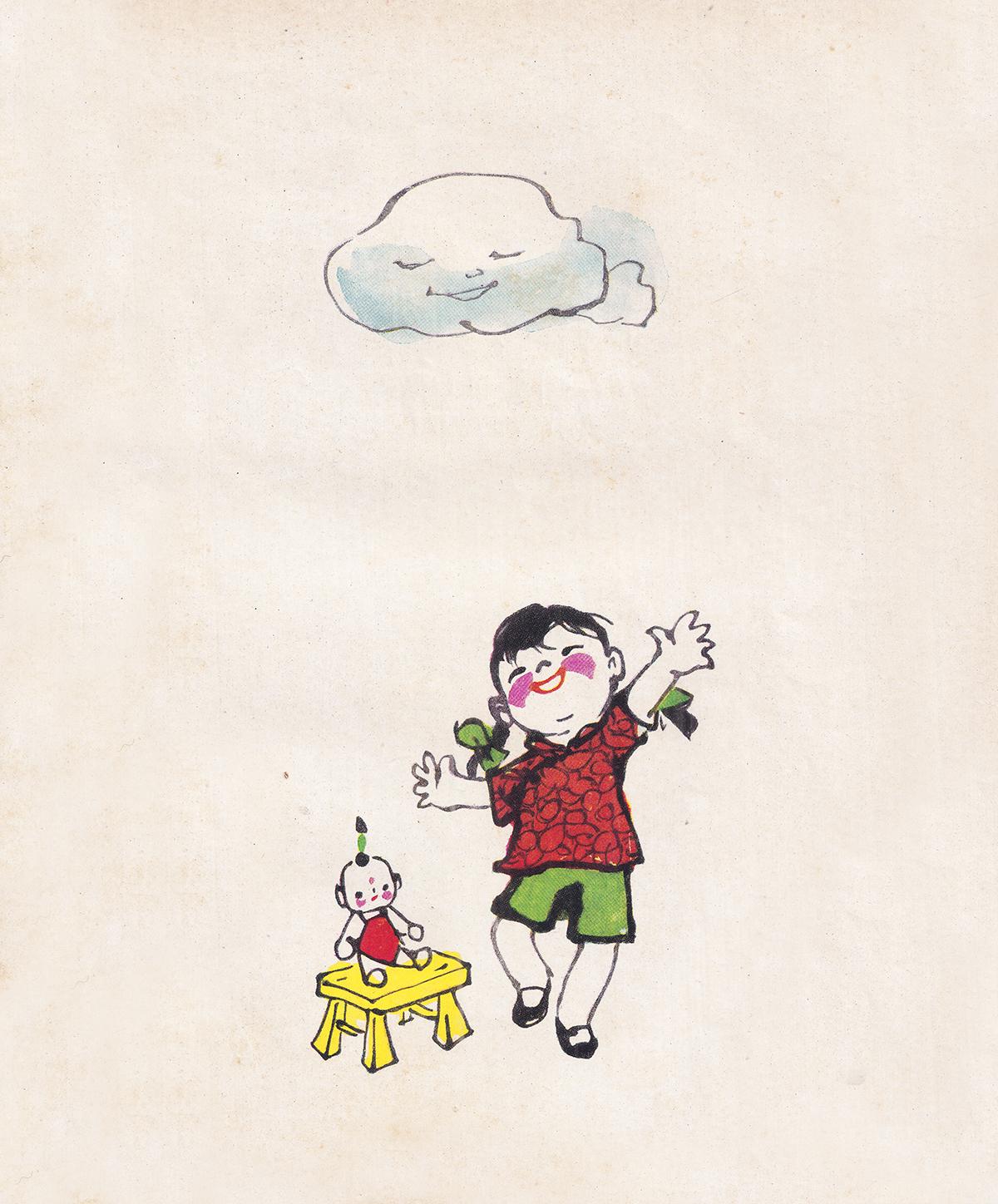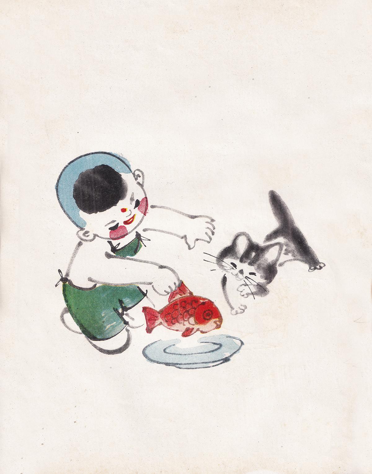 整本插图一半黑白线描、一半彩色水墨,内容全是旧日中国孩童的日常: