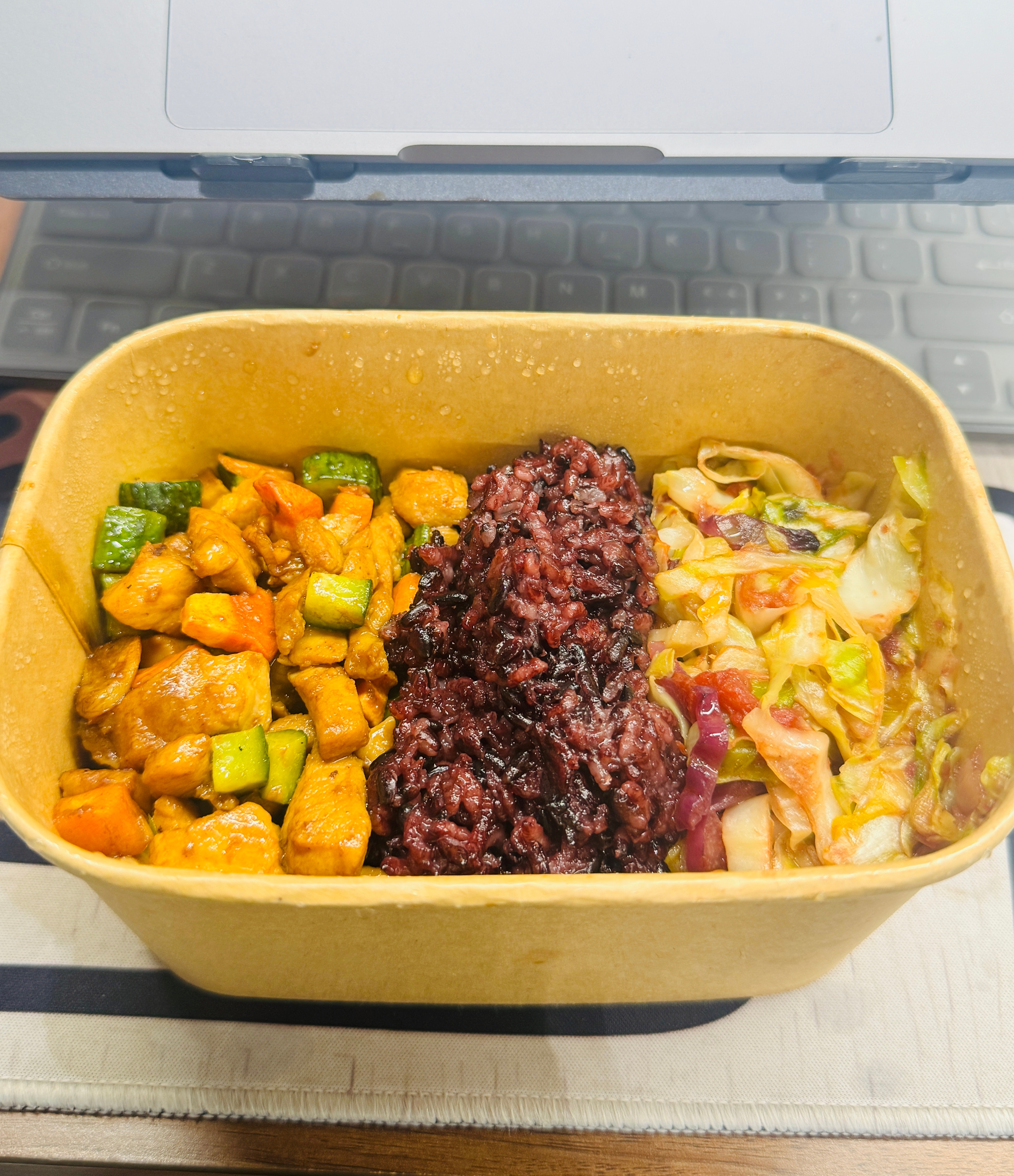 今日工作餐打卡酱爆鸡丁,羽衣甘蓝+西红柿+圆白菜(混合炒),饮料是九龙斋。我吃饭