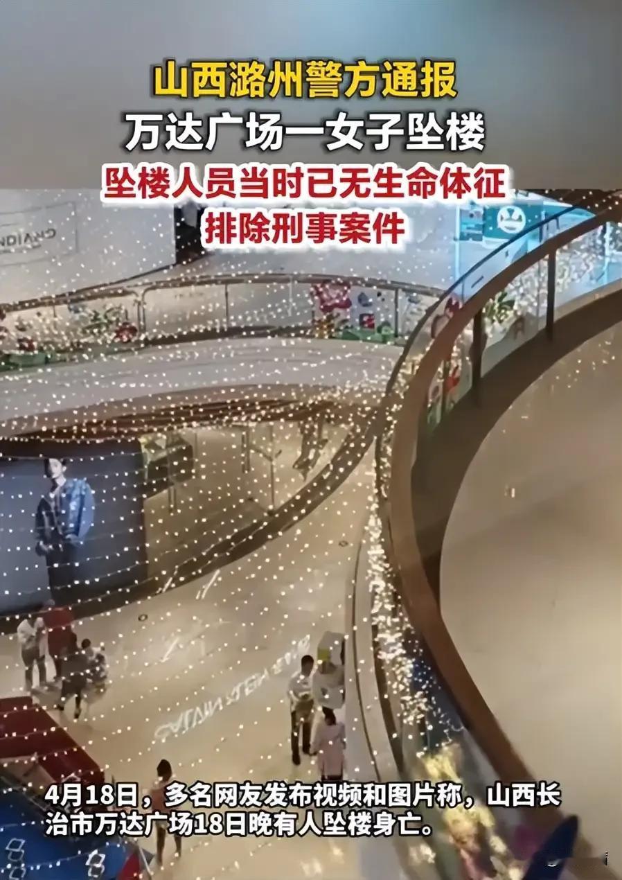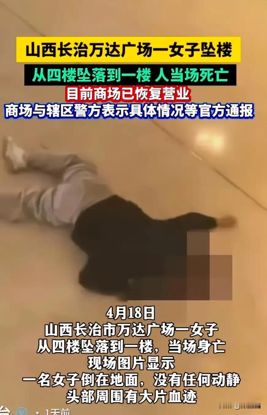 4月18号周六傍晚6点多,正是长治万达人最多的时候,四楼餐饮区还飘着饭香,谁也没料到会出事。一声闷响后,一名女子倒在一楼地面,身边很快都是血,商场工作人员赶紧围起现场,报了警也叫了急救,但医护人员到后确认人已经没了生命体征。