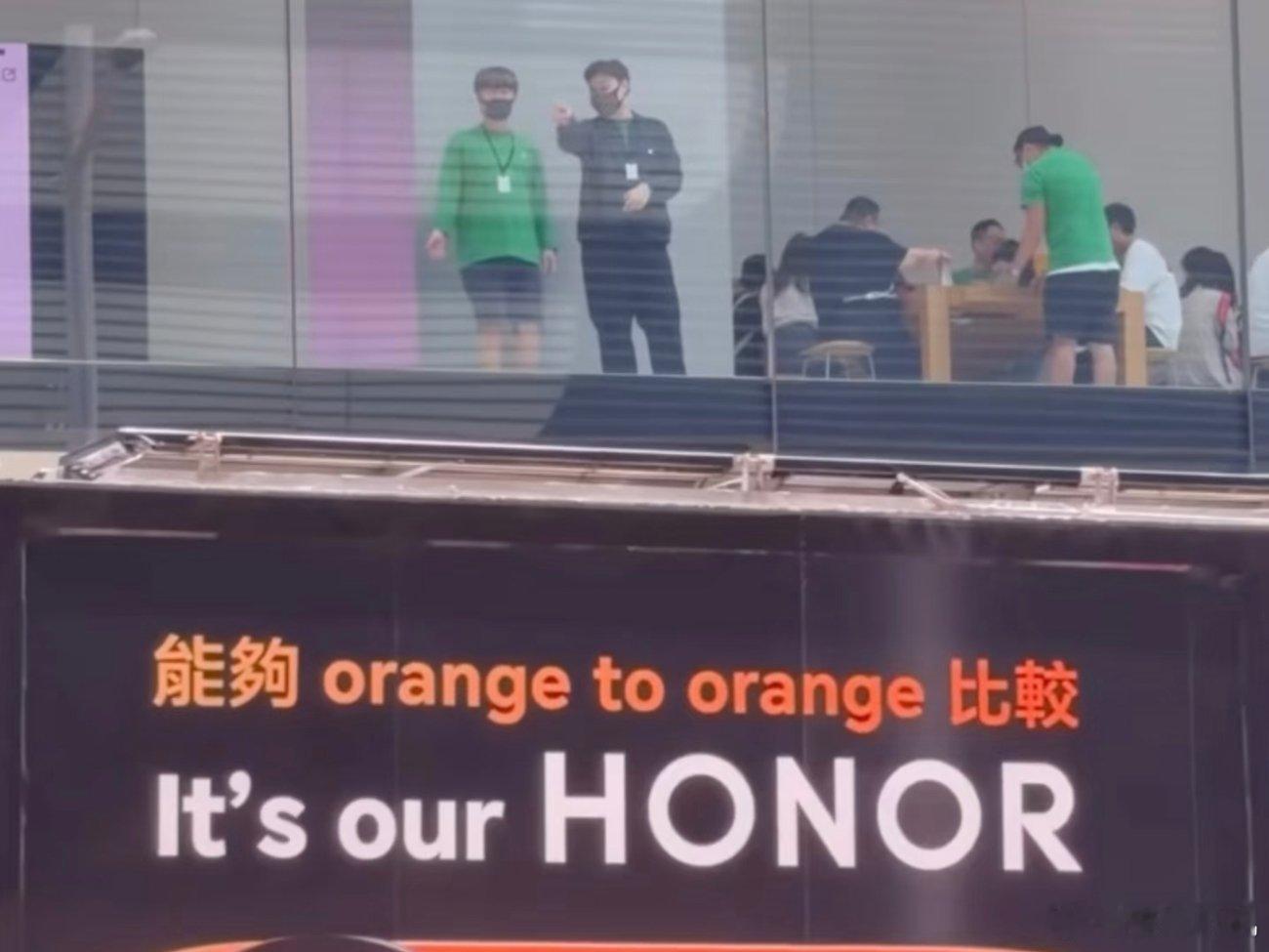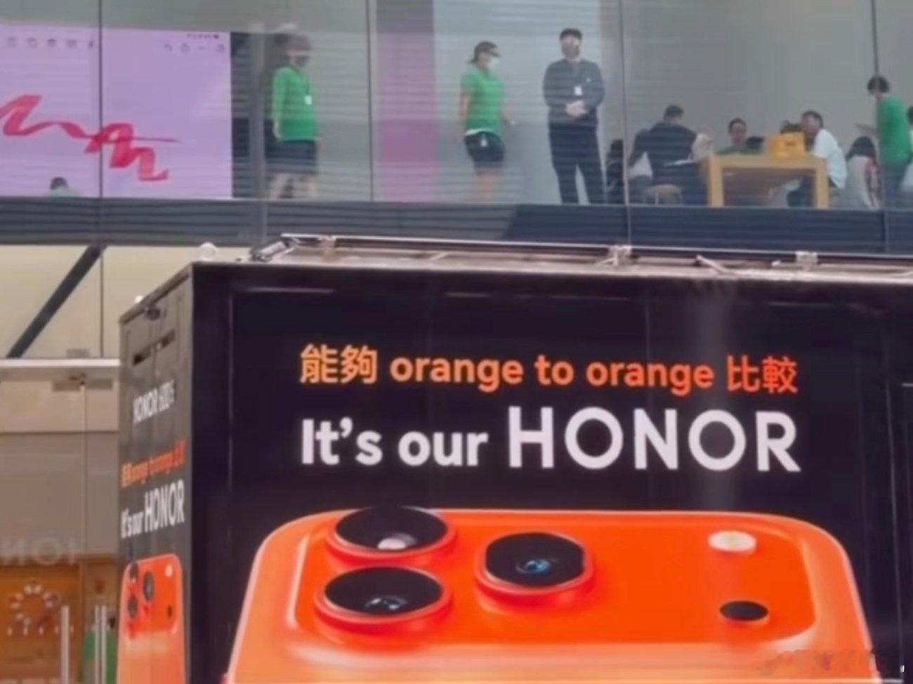 前几天发生在香港的一件有意思的事情,荣耀开着一辆车去苹果门店“踢馆”,在车上印着的意思大概是能够和你们(苹果)比较,是我们的荣耀,引来楼上苹果工作人员围观。
