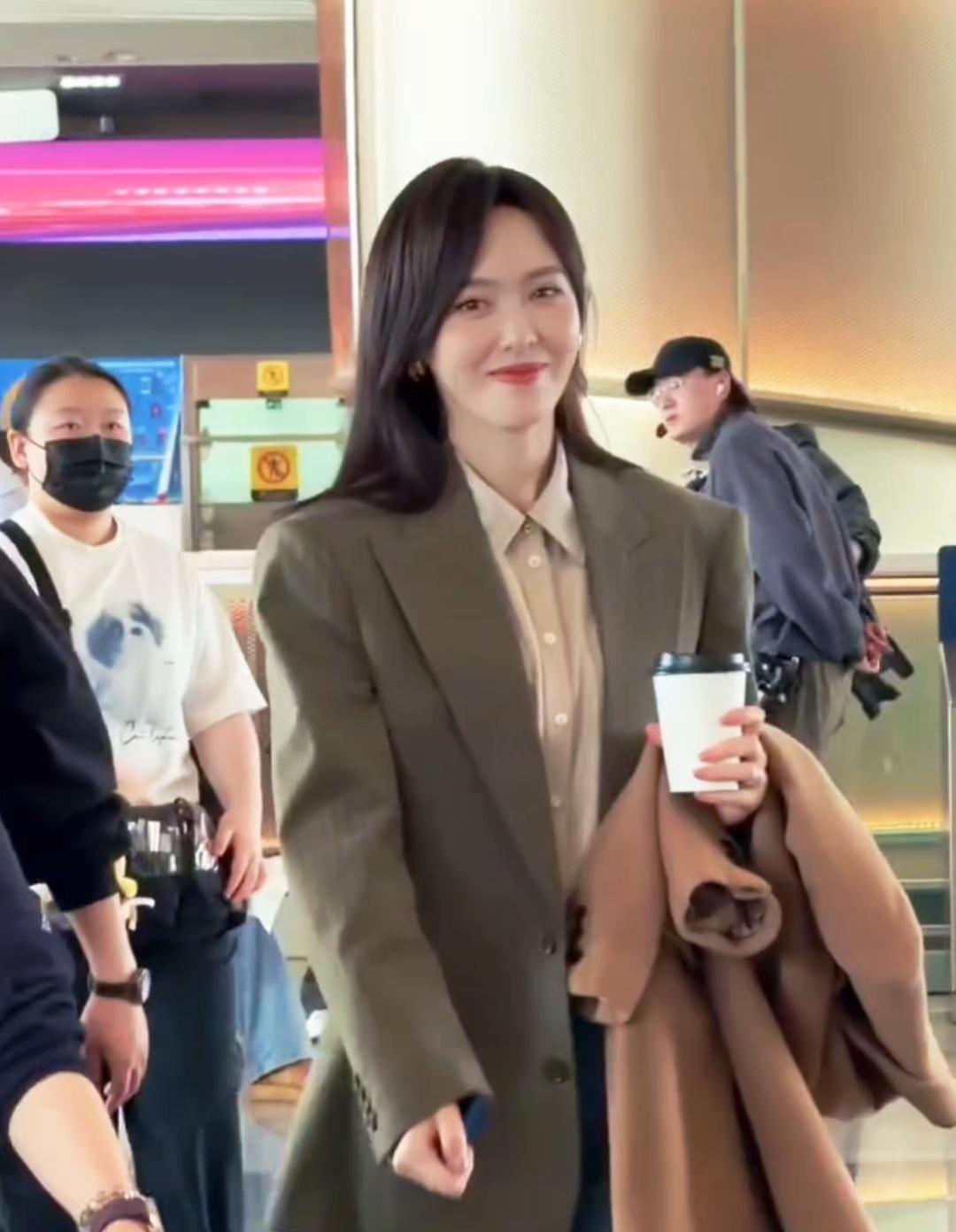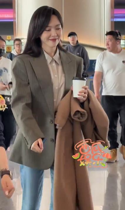 唐嫣里面穿浅色的衬衣,外面套着灰色的大码西装,整个人显得端庄又秀丽。
