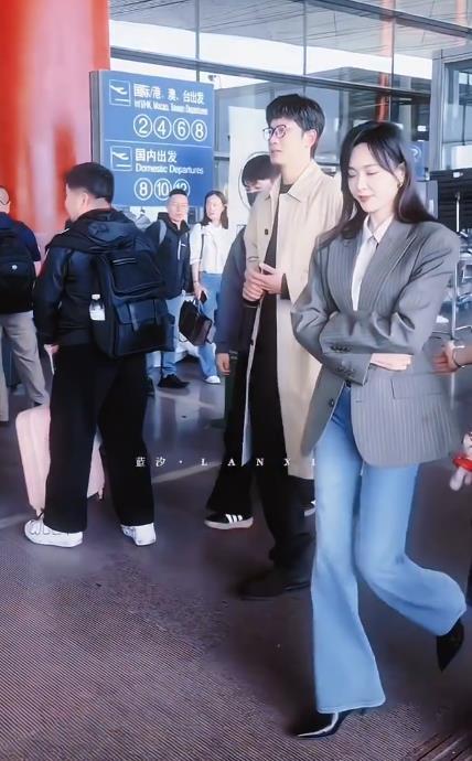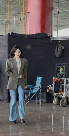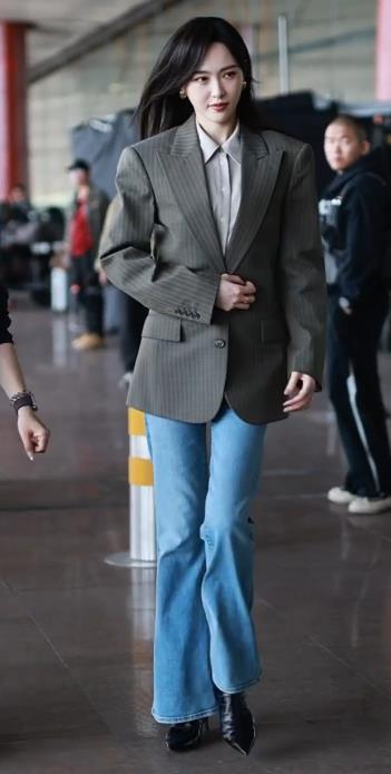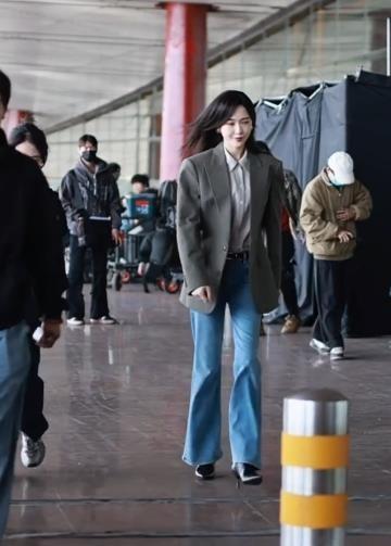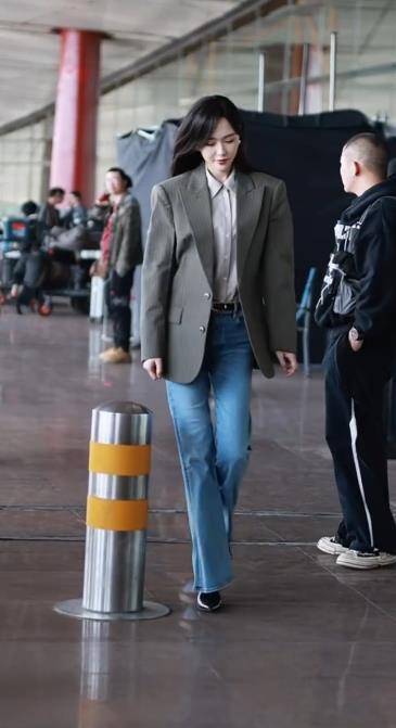 今天唐嫣在录制新剧的时候搭配的很有潇洒干练之美,看上去确实是很有职业丽人范儿。