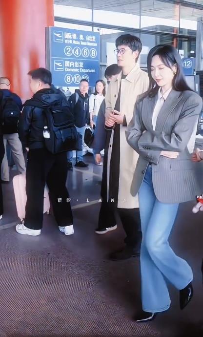 她下身穿浅蓝色的牛仔细腿裤,秀出了纤细的大长腿,还秀出了完美的身材比例。