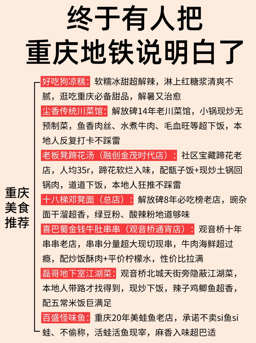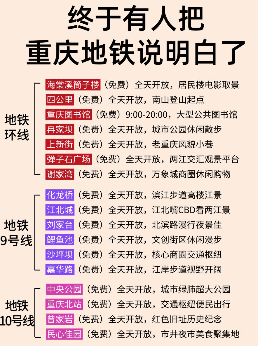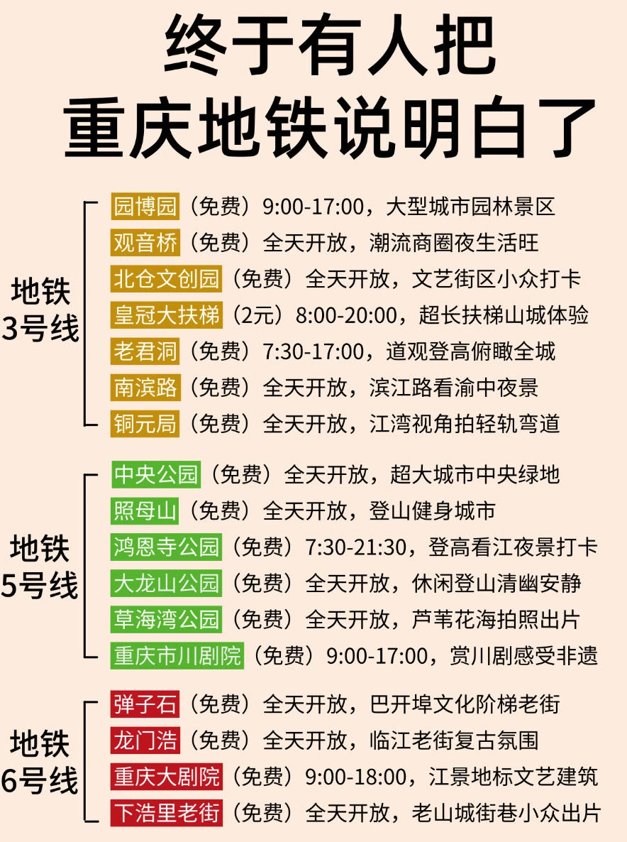 来重庆不知道怎么玩的,可以参考一下这份地铁边上的景点✔️分布,初来重庆的可以🐎起来了!